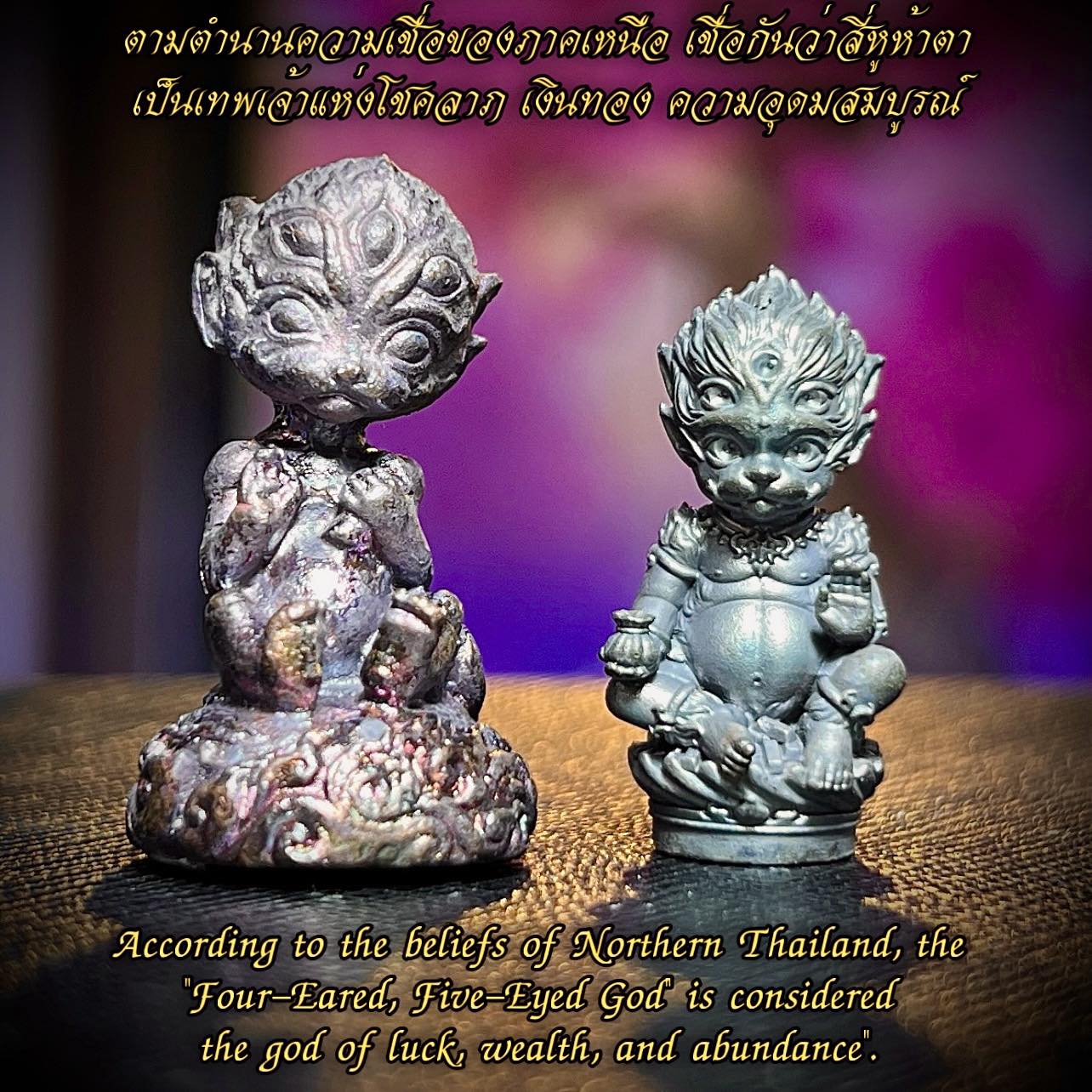 “สุดยอดเครื่องรางของขลังสายล้านนา ตามตำนานความเชื่อของภาคเหนือ เชื่อกันว่าสี่หูห้าตาเป็นเทพเจ้าแห่งโชคลาภ เงินทอง ความอุดมสมบูรณ์”