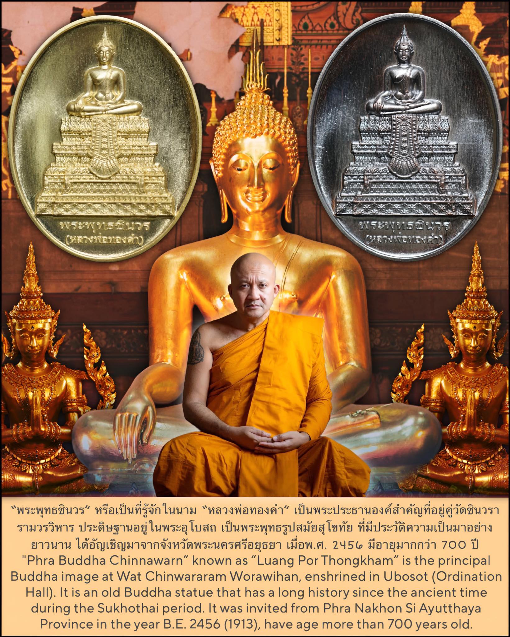 Phra Buddha Chinnaworn coin (Luang Por Thongkham) by "Phra Mongkol Waropakarn" or "Luang Por Than Chao Khun Chamnan Uttamapanyo, Abbot of Wat Chinwararam Worawihan (Royal Monastery), Pathum Thani Province. “Phra Buddha Chinnawarn” known as “Luang Por Thongkham” is the principal Buddha image at Wat Chinwararam Worawihan, enshrined in Ubosot (Ordination Hall). It is an old Buddha statue that has a long history since the ancient time during the Sukhothai period. It was invited from Phra Nakhon Si Ayutthaya Province in the year B.E. 2456 (1913), have age more than 700 years old. พิธีพุทธาภิเษกวัตถุมงคลรุ่น "จตุรพิธพรชัย" อันมีความหมายว่า พรที่จะทำให้เกิดความสวัสดีมีชัย ๔ ประการ ประกอบด้วย: 1.อายุ คือ ให้มีอายุยืน มีชีวิตที่ดี 2.วรรณะ คือ ให้มีความสวยงาม มีชื่อเสียงเกียรติยศ 3.สุขะ คือ ให้มีความสุขกายสบายใจมีความสะดวก 4.พละ คือ ให้มีกำลังกายกำลังใจกำลังทรัพย์มีพวกพ้องบริวาร
