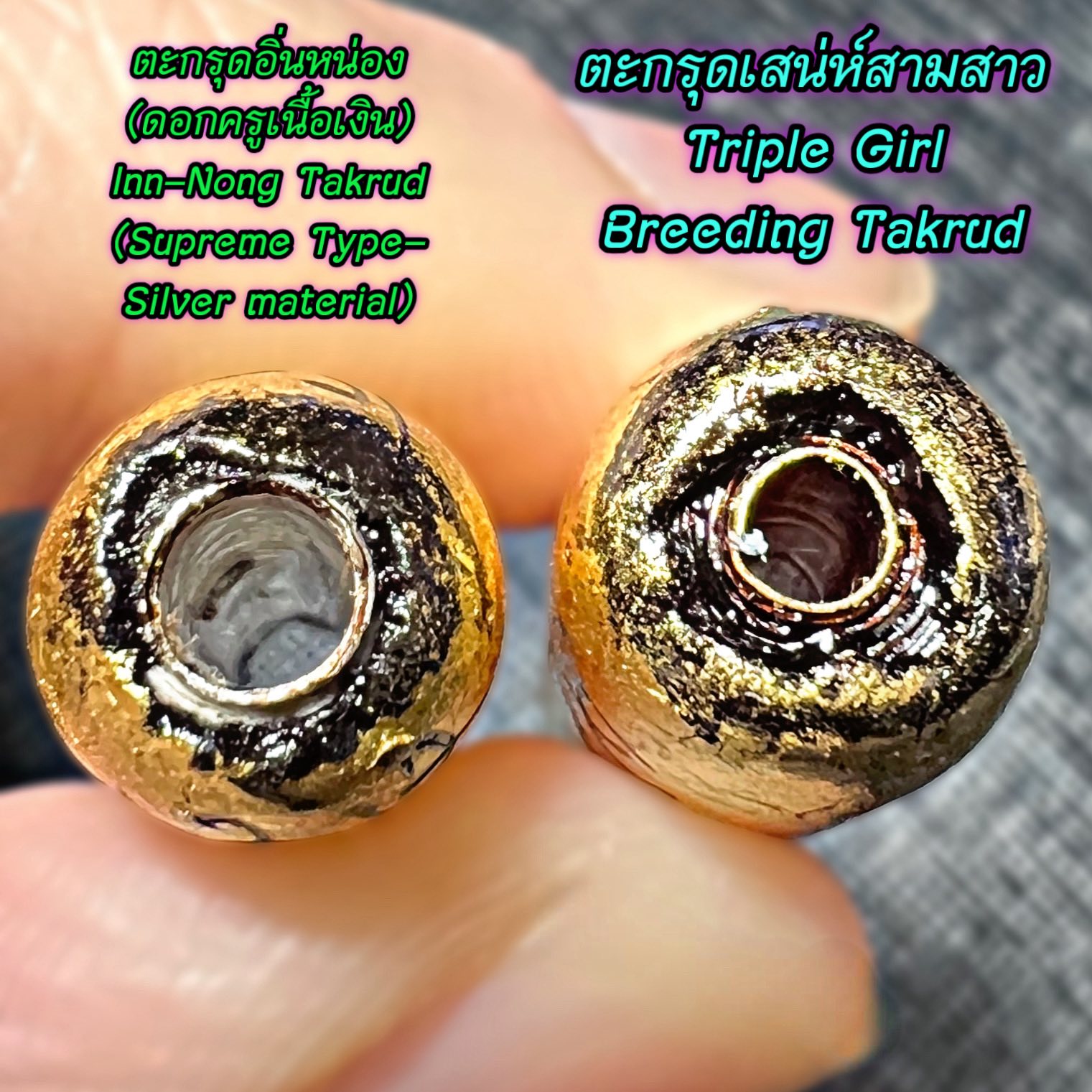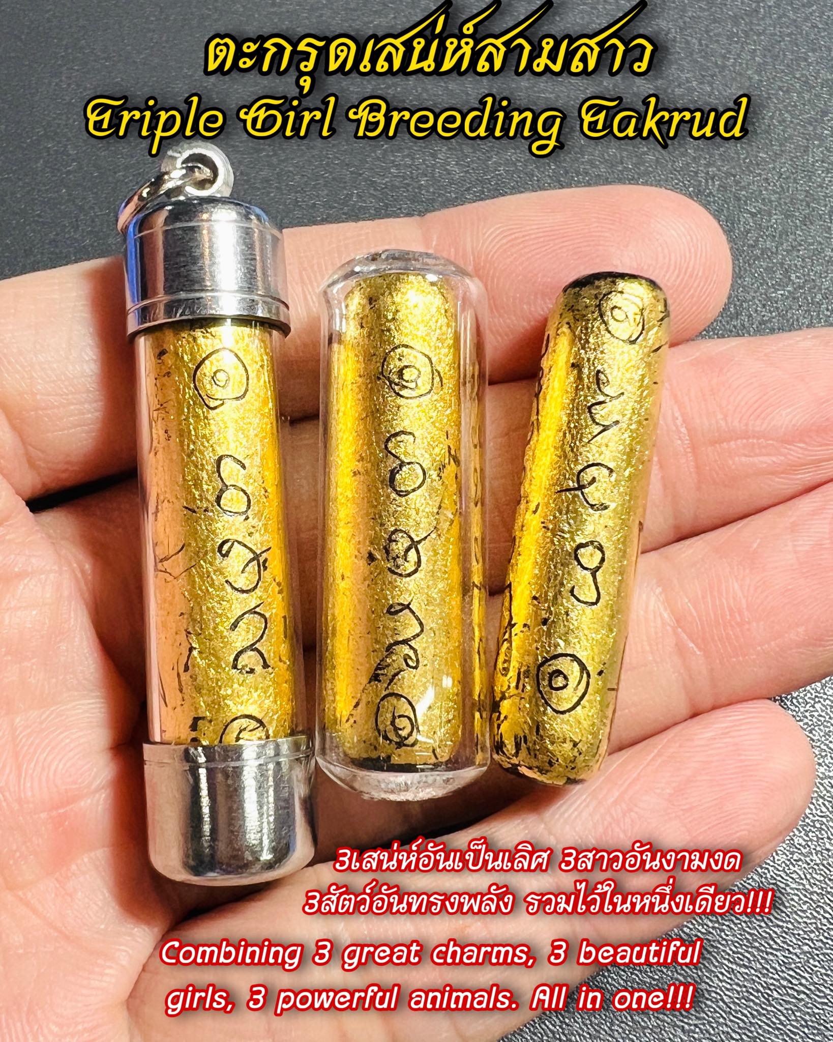Triple Girl Breeding Takrud by Kruba Thakoon, MaePhae Temple, Chiang Mai Province. Combining 3 great charms, 3 beautiful girls, 3 powerful animals. All in one!!! The copper plate that was rolled to be Takrud inside was inscribed with the special set of Yantra from the greatest Lanna legendary magic in the field of powerful charm, consisting of 1. Ma Sep Nang (Horse And Girl), the fierce lust, 2. Chang Sep Nang (Elephant And Girl), the huge desire, and 3. Nak Pun Nang (Snake Entwine Girl), the cuddle passion. The origin of these subjects is about how to maintain lineage & the exuberance of all living species which still exist in the land of lust, still have lust in instinct, and still seek sex. It is considered a famous, charming amulet of the Lanna magic with unique art. Kruba Thakoon drew the images and wrote Yantras together with a magic blessing by himself for every step until this Takrud is alive.