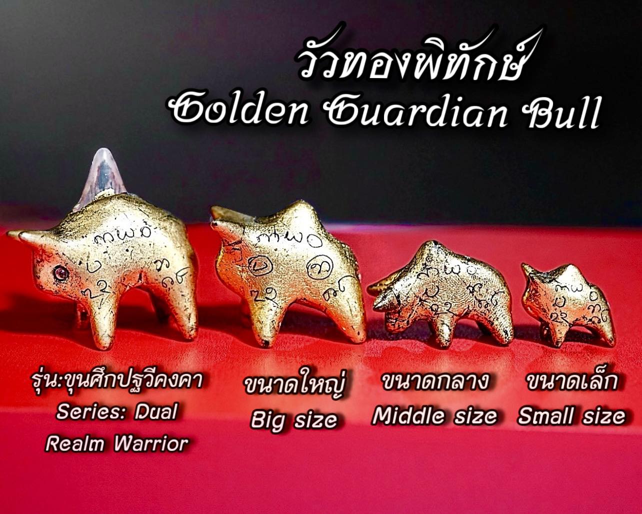 You can use this Golden Guardian Bull to watch over your house or mark a safe area around the house, or any place where there is strong magic. You must focus your mind on meditation, and think of the Buddha, Dhamma and Sangha, the Deities and Kruba Thakoon. Moreover, you can wear or carry this Golden Guardian Bull with you, or put it in your vehicle as protection from accidents of all kinds. If there are ever any visitations or experiences with contacting dark entities, all you need to do is dedicate some of the fruits of your merits to them, and think of Wua Thanu, and they will disappear. No need to feed food to this Wua Thanu, the owner just makes merits and shares the good deeds with it.