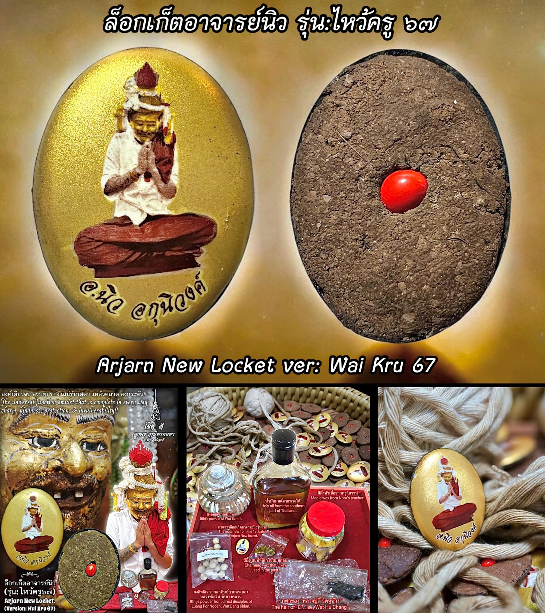 - The materials from the 1st batch of Arjarn New locket that was widely talked about among the disciples for its powerful ability. For example, someone hung his locket and was shot by an enemy but no bullet came out, some were shot by an attacker at close range until their shirts were torn, but their skins were not damaged. Many people wearing his locket also got good trade and there was no shortage of customers.