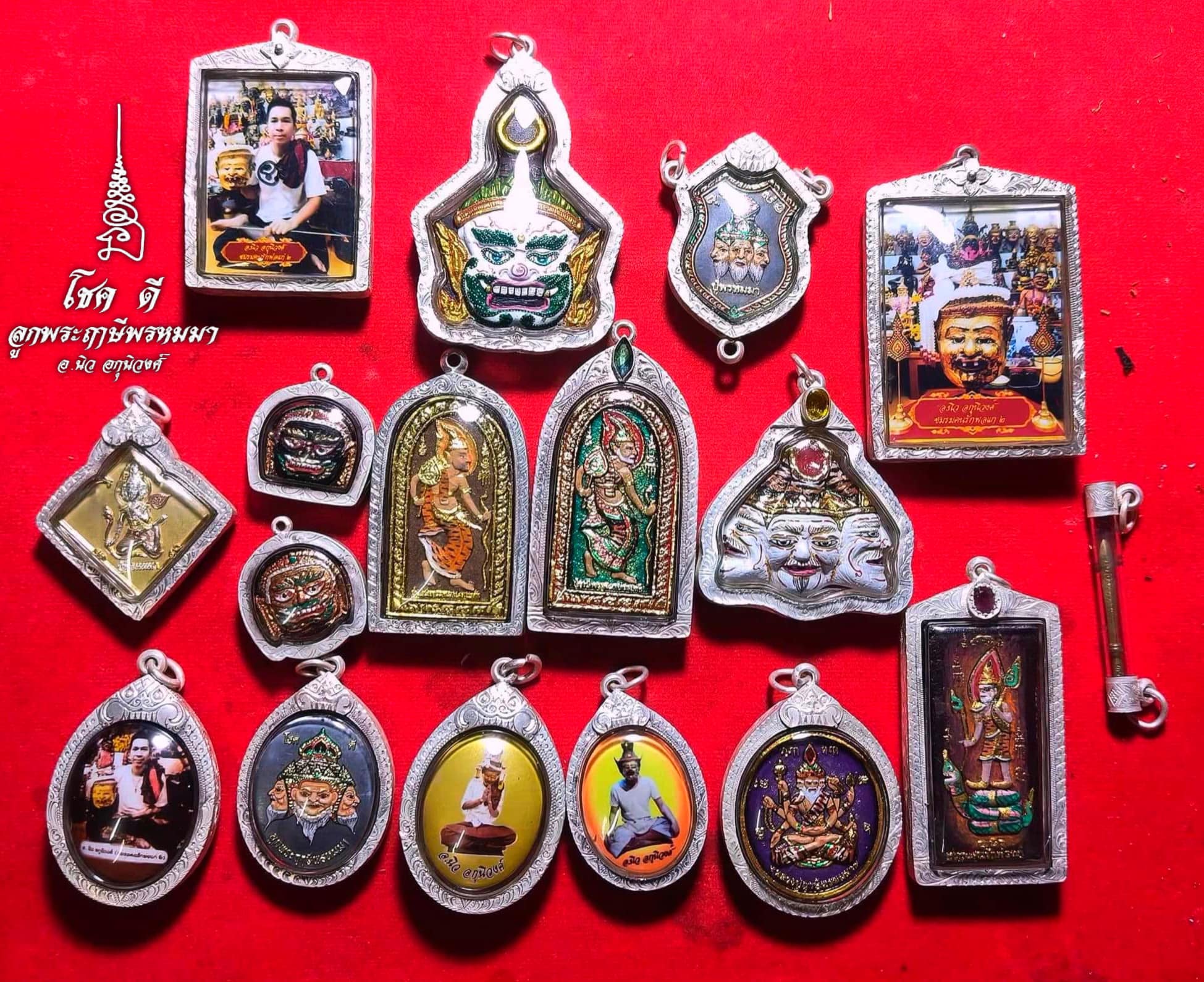 The sacred amulets of Arjarn New Akuniwong, from various editions, with each piece specially encased in silver casing by his disciples for personal use and reverence. Some of these amulets in this tray, just by seeing them, are considered a blessing because it is so difficult to find one.