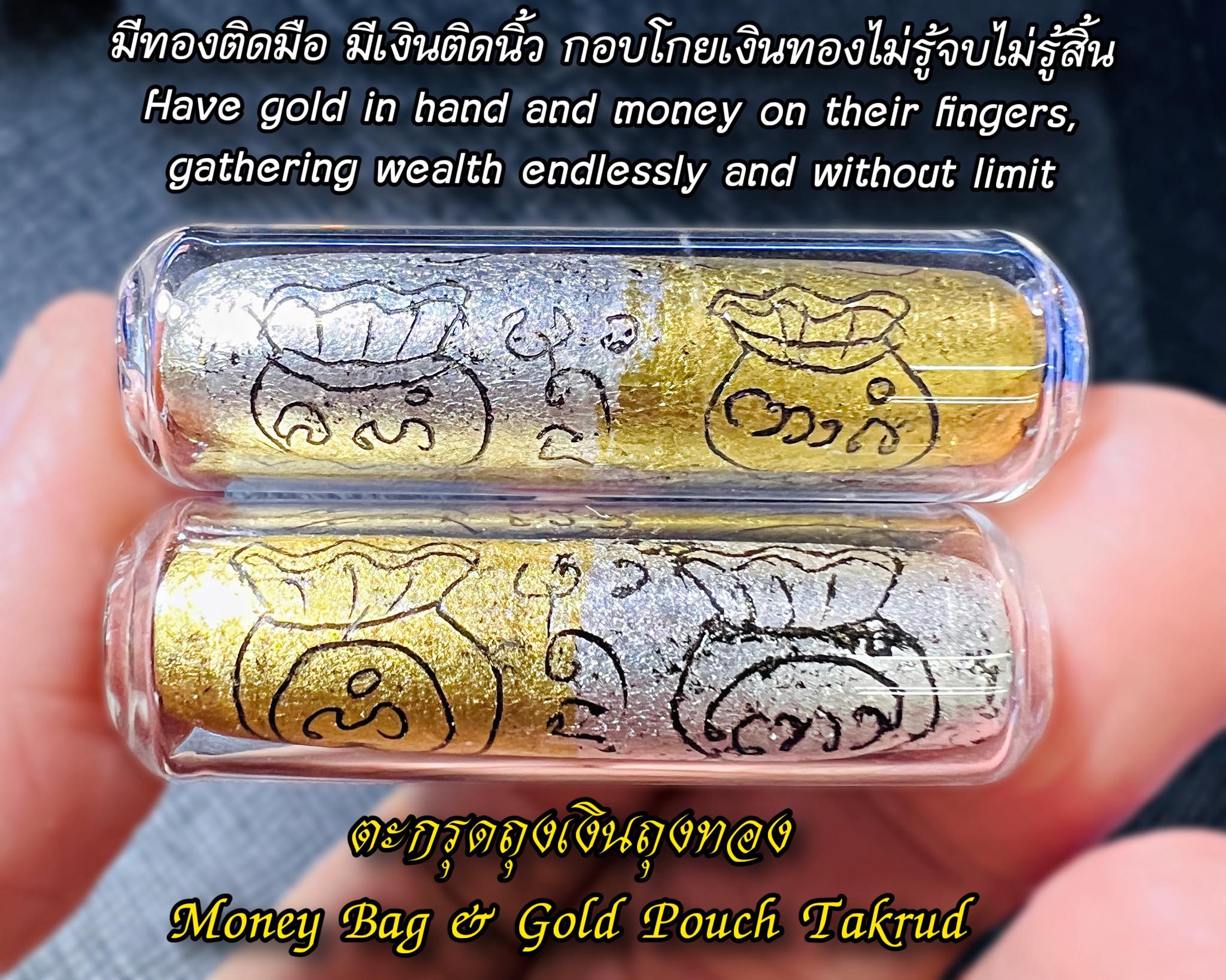 “Money Bag & Gold Pouch” is a symbol of wealth and richness, keeping treasure safe and effective without leakage. It is believed that whoever worships this Takrud will have gold in hand and money on their fingers, gathering wealth endlessly and without limit.