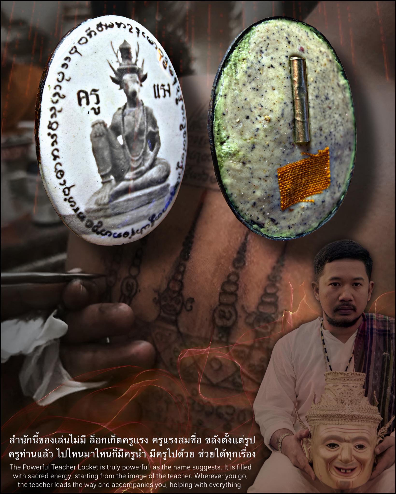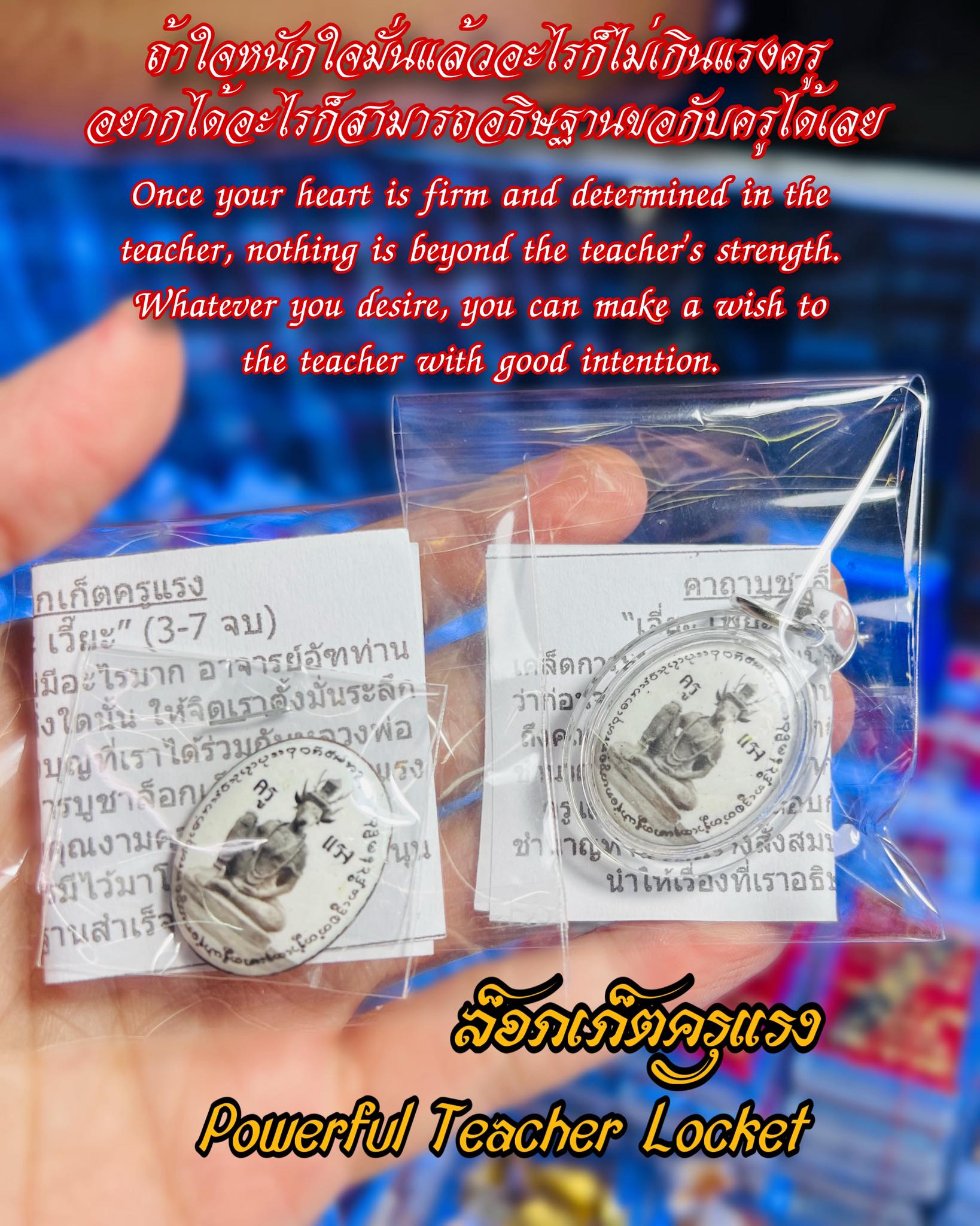 Arjarn Aut says: "I never sell toys. The Powerful Teacher Locket is truly powerful, as the name suggests. It is filled with sacred energy, starting from the image of the teacher. Wherever you go, the teacher leads the way and accompanies you, helping with everything. It brings great blessings and is highly auspicious for its owner. It is suitable for reverence by people in all professions. Its virtues include great compassion, popularity, wealth, protection, and the power to bring success. The teacher is number one; the teacher is the ultimate. Once your heart is firm and determined in the teacher, nothing is beyond the teacher's strength. Whatever you desire, you can make a wish to the teacher with good intention. The creation of this locket itself is a merit upon merit, a good deed that brings success, because merit leads the prosperous way. The Powerful Teacher Locket thus carries both the power of the teacher and the power of merit. It is a truly auspicious amulet, from the beginning to the end."