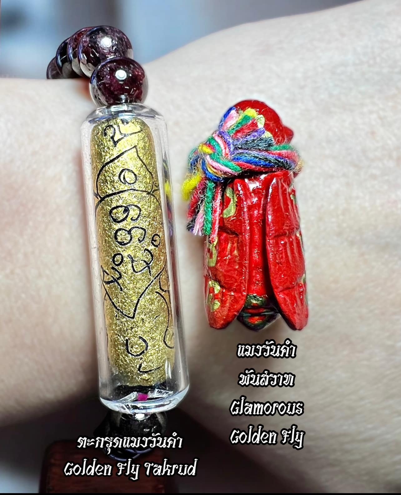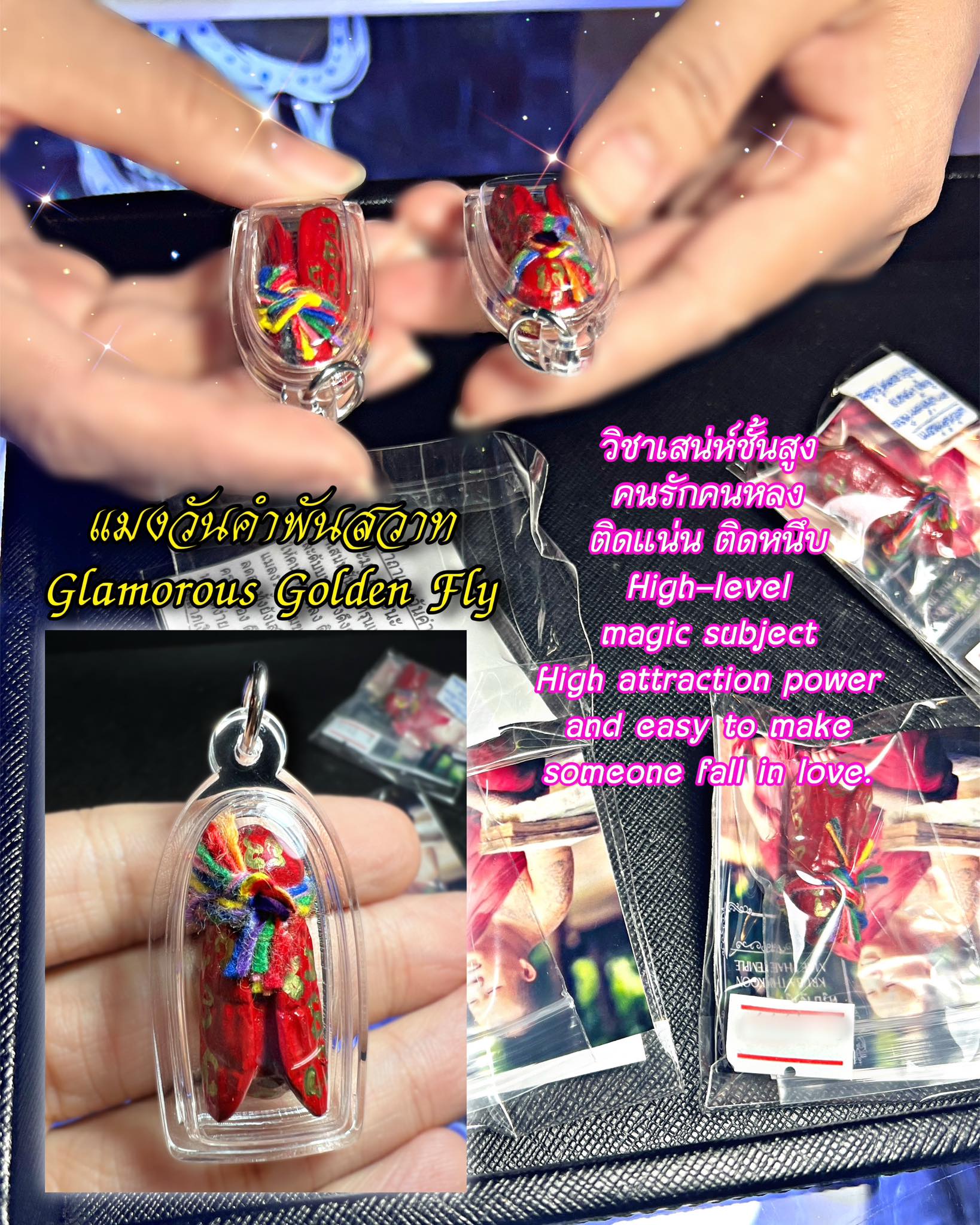"Golden Fly" is a high-level magic subject that has strong power in both sexual charm and upper charm to overcome people. Also, support the owner to be a charming guy, having high attraction power and easy to make someone fall in love like as the fly never stop to smell its target. Being the real Casanova who can find a lover couple easily, quickly and many. It will attract high-class people, good partners, good business partners, money, opportunity, and luck come to the owner and also support the owner's destiny also. In fact, the power of the Golden Fly is more than words can describe, so the best way to know its power is that you should have it and experience it with yourself.