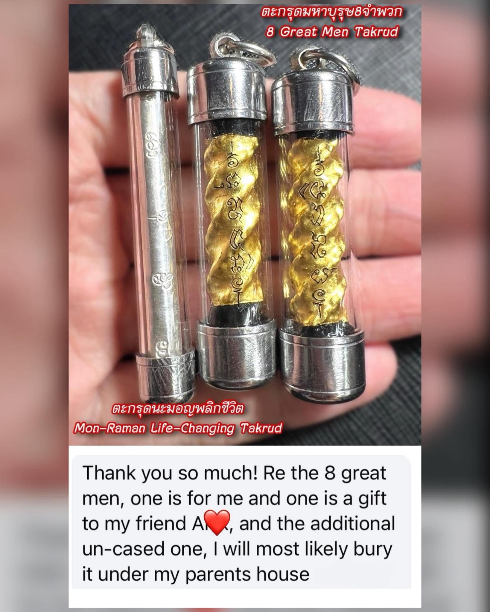 With sacred power kept close, one can move forward with confidence in everything they do. This international believer chose to worship the “Mon-Raman Life-Changing Takrud,” carrying it for destiny support, along with the “8 Great Men Takrud,” one kept at home to enhance auspiciousness, and another gifted to a close friend.