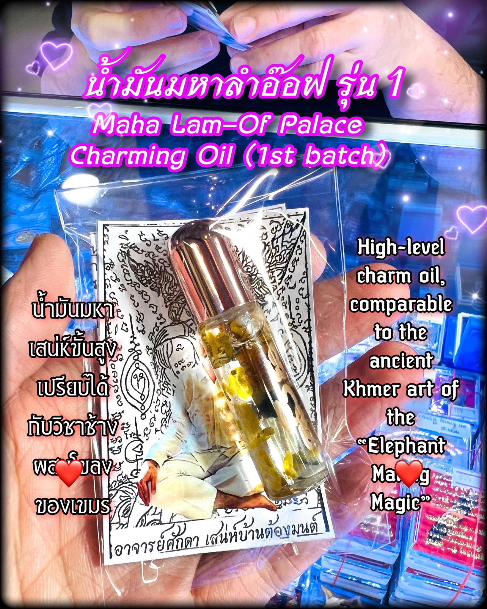Stories of its power became more and more widespread, sparking a growing trend as people sought to obtain it. Especially those who had once worshipped with it and were running low, they were eager to find more, fearing they might never again come across an oil as powerful as this one. Maha Lam-Of Palace Charming Oil is a high-level charm oil, comparable to the ancient Khmer art of the “Elephant Mating Magic” in terms of its potency. Arjarn O Sakda directly studied the sacred art of crafting Maha Lam-Of Palace Charming Oil under Luang Por Noppawan, and was also entrusted with a dozen vials of the original concentrated formula from Luang Por Noppawan himself. Arjarn O Sakda was well aware of the legendary reputation of this oil, having had the opportunity to use and worship it himself. He shared that when he applied this oil on his body, just the scent alone can cast a powerful spell on others. Some people become so enchanted that they feel restless and can’t bear to be away from him, they constantly want to be near, following him around like a kid stuck to their mom. Even after a short time apart, they find themselves missing him again. Simply walking past someone can cause them to turn around and look back at him, such is the effect. Arjarn O Sakda emphasized that, in truth, you don’t even need to apply the oil, just carrying the bottle with you is already powerful enough. It is like a living oil, imbued with spirit and consciousness, as devotees can make specific intentions or prayers to it, especially when it comes to matters of attracting someone's heart and mind. Many have witnessed clear and undeniable results from doing so. The potency of Maha Lam-Of Palace Charming Oil was so intense that it gave Luang Por Noppawan quite a headache, due to the chaos that arose from how people used it, many came back asking him to resolve problems caused by its misuse. Back when he created it for his disciples and followers, he never expected things to spiral out of control. He even admitted to himself that he probably shouldn’t have made it, as its power turned out to be a bit too strong. Originally, his intention was to preserve the sacred knowledge and to help people use it as a tool for improving their livelihood. But more often than not, people ended up using it in the wrong way. When it comes to the ingredients of Maha Lam-Of Palace Charming Oil, they consist of rare and inherently potent materials. Examples include musth elephant oil, vulture oil during mating season, rhinoceros oil in heat, and even tears of a dugong (mermaid's tears). In addition, various specialized magical herbs of attraction are also included. All of these are meticulously simmered together using a secret oil base recipe, then consecrated through ritual chanting for at least one full rains retreat (three months) before the oil is considered complete, according to the traditional texts. In the creation of this latest batch of Maha Lam-Of Palace Charming Oil, Arjarn O Sakda followed the same path, his intention is to preserve and carry on the sacred knowledge. He created it for people to worship and use as a spiritual aid in their careers, businesses, and trades, so they may prosper, have enough to live on, and enjoy a more comfortable life.However, if someone chooses to use it for other purposes, that is entirely up to their own judgment.Intentions determine karma. All he asks is that it be used with mindfulness and a sense of right and wrong. Inside the bottle, there are God Be Agitated Takrud (Thep Ranjuan Takrud) and Gods Groan Takrud (Thep Ramluk Takrud), along with a love-binding thread. This thread has been used in the traditional wrist-tying ceremony performed on babies who cry when separated from their mothers. In occult practices, it is considered a powerful and mysterious charm with strong enchanting effects. Arjarn O Sakda consecrated this thread and specially enclosed it within the bottle to enhance its potency. ![]() ให้ภาพบรรยายว่าต้องเด็ดถึงใจขนาดไหนถึงมีไว้บูชามากมายขนาดนี้ท่านอาจารย์โอศักดา สำนักบ้านต้องมนต์ ชื่อนี้จำไว้ให้ดี ท่านตั้งใจสร้างของดีที่ทุกคนนำไปใช้ได้จริง