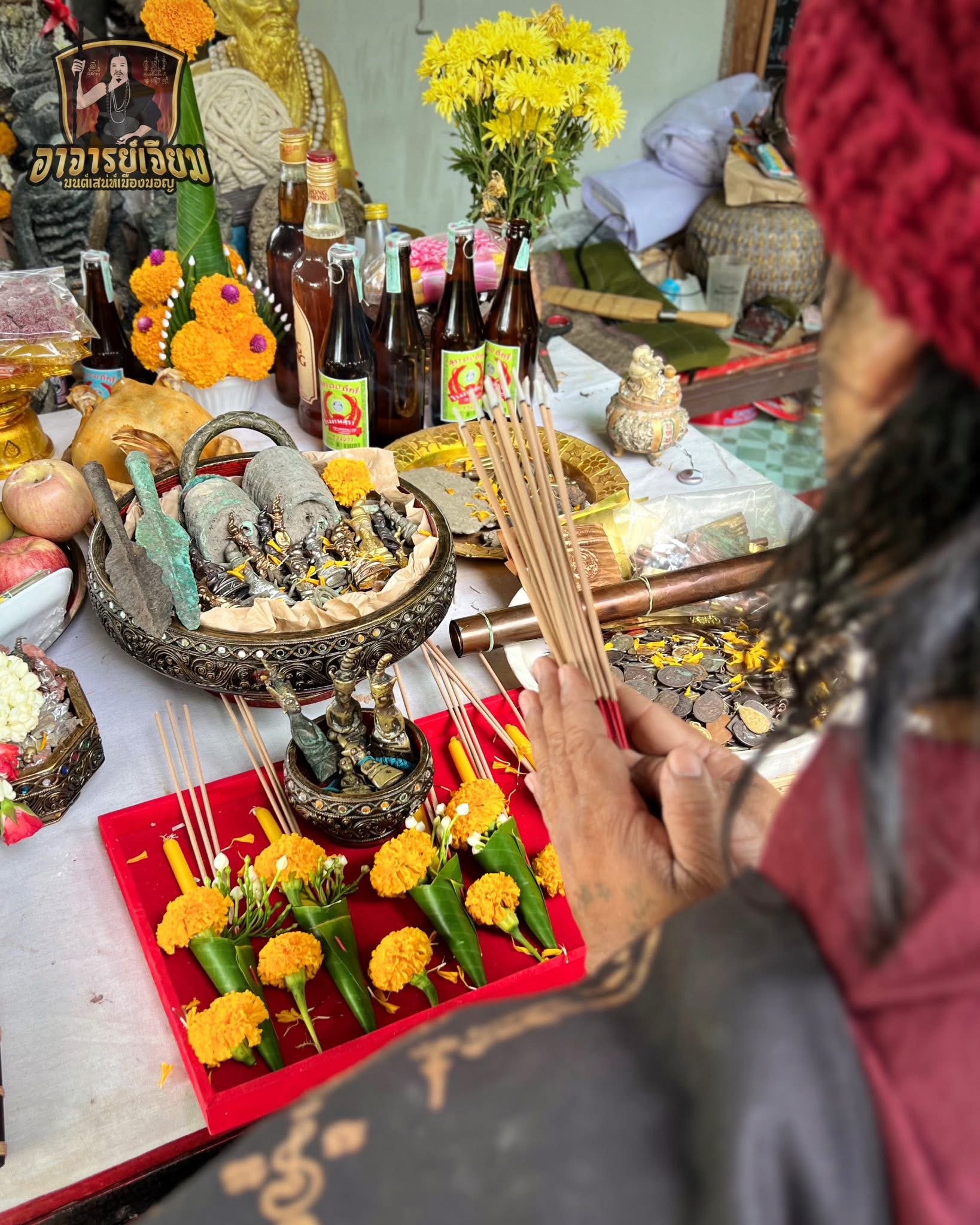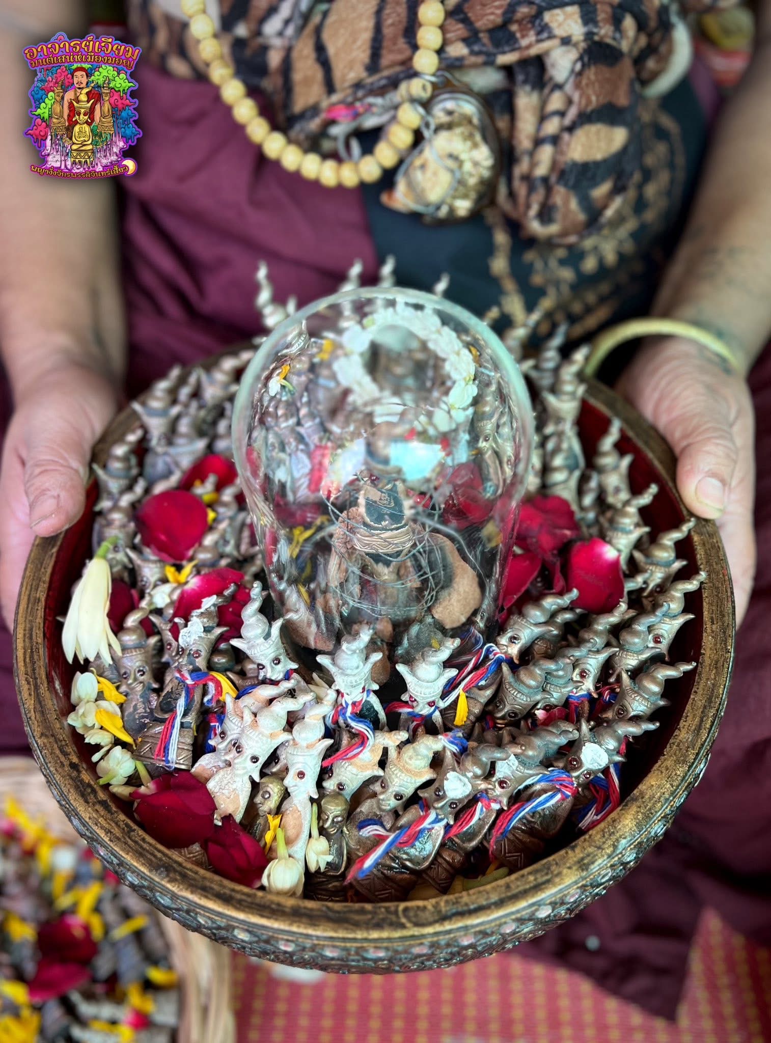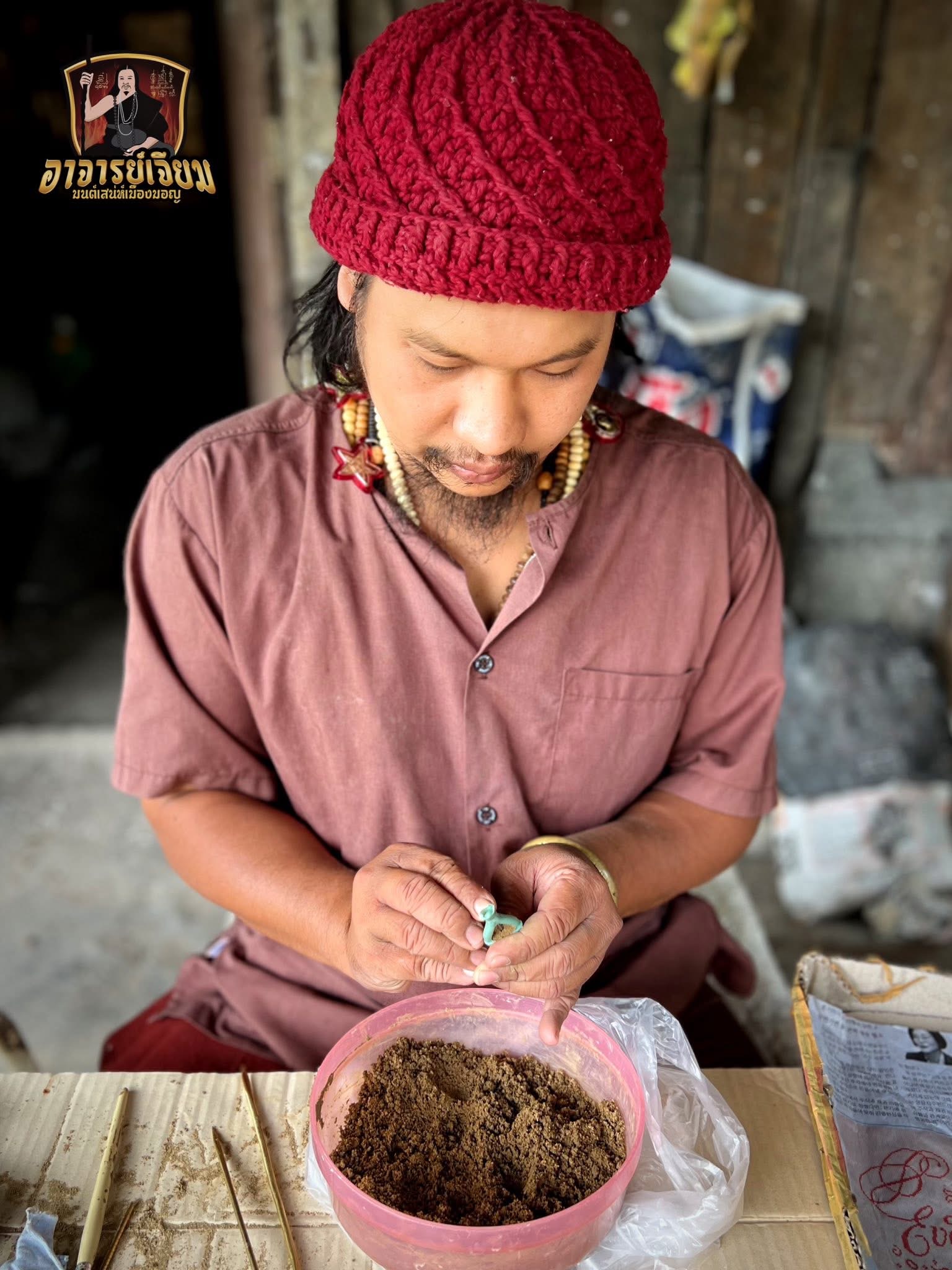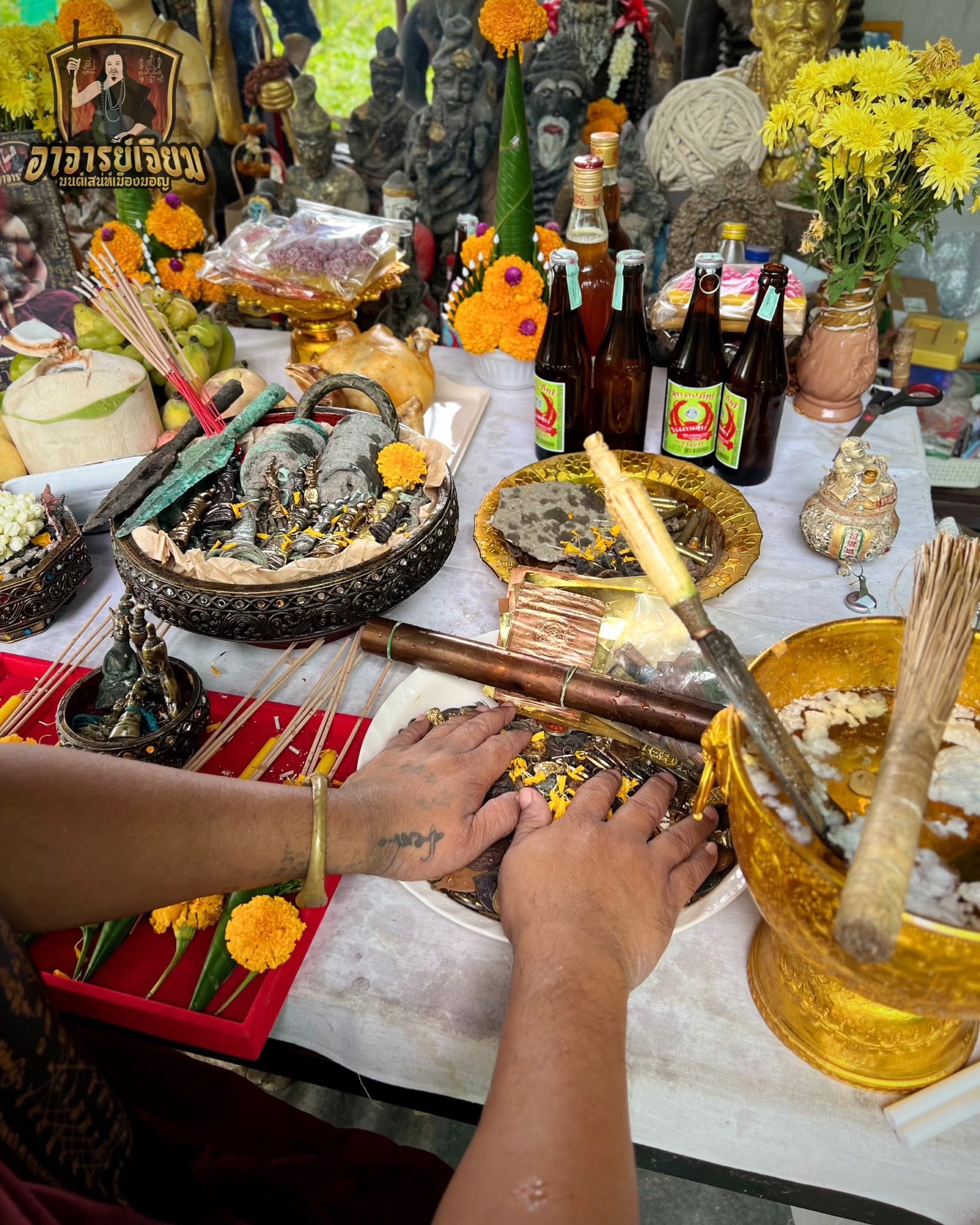Arjarn Jiam performed a ceremonial offering and homage to the lineage of master teachers and ancestors who had created sacred objects since ancient times, from the Ayutthaya period, through Thonburi, and into the Rattanakosin era, including his present-day teachers. The purpose of the ritual was to request permission to consecrate and repurpose broken fragments of Phra Chai amulets (Phra Ngang Ayutthaya), which were then ground into sacred powder and mixed with various mystical herbs. This sacred mixture would later be used to fill the base of the Phaya Ngang Chakrapat Jan Siao (Crescent Moon Emperor Ngang).