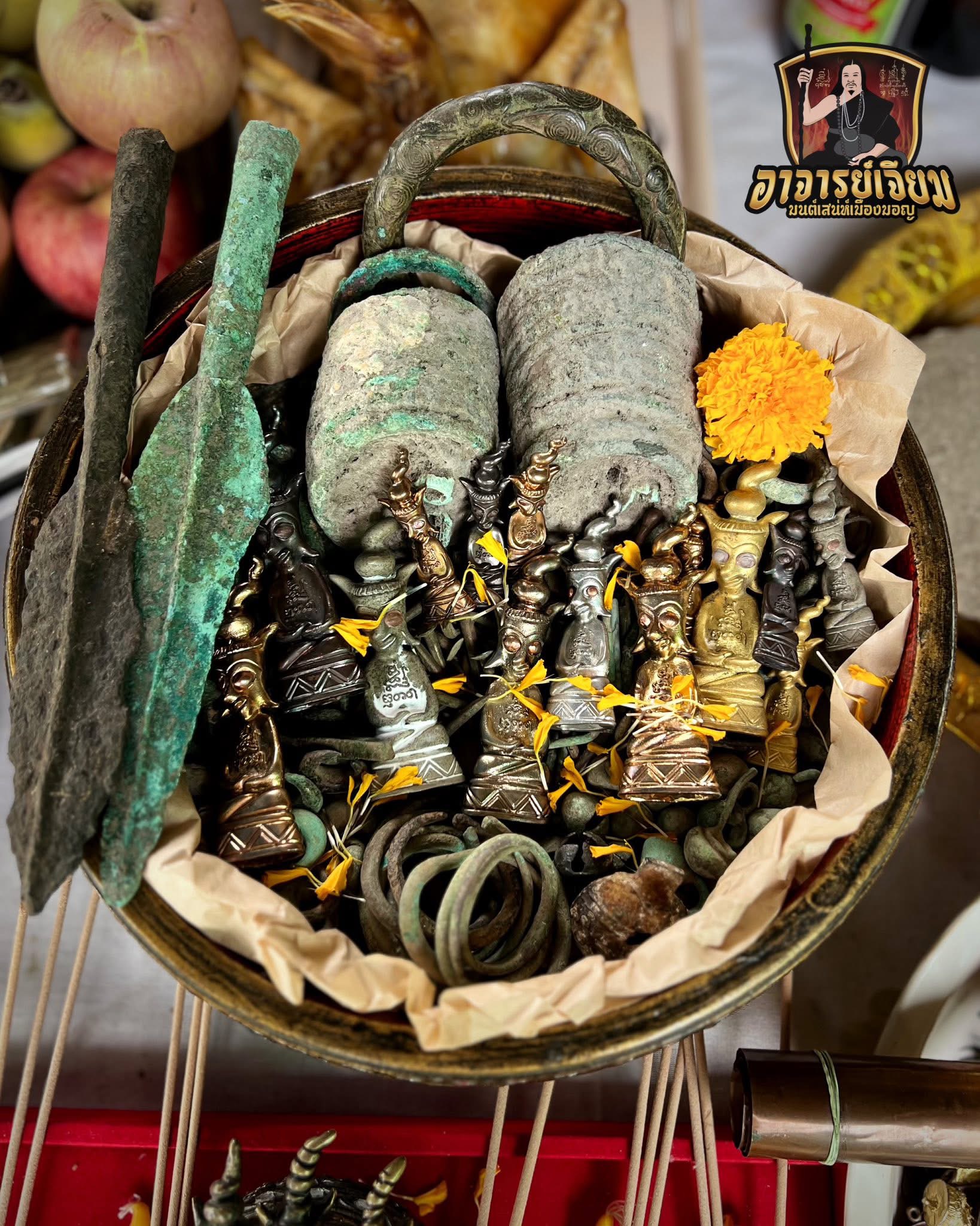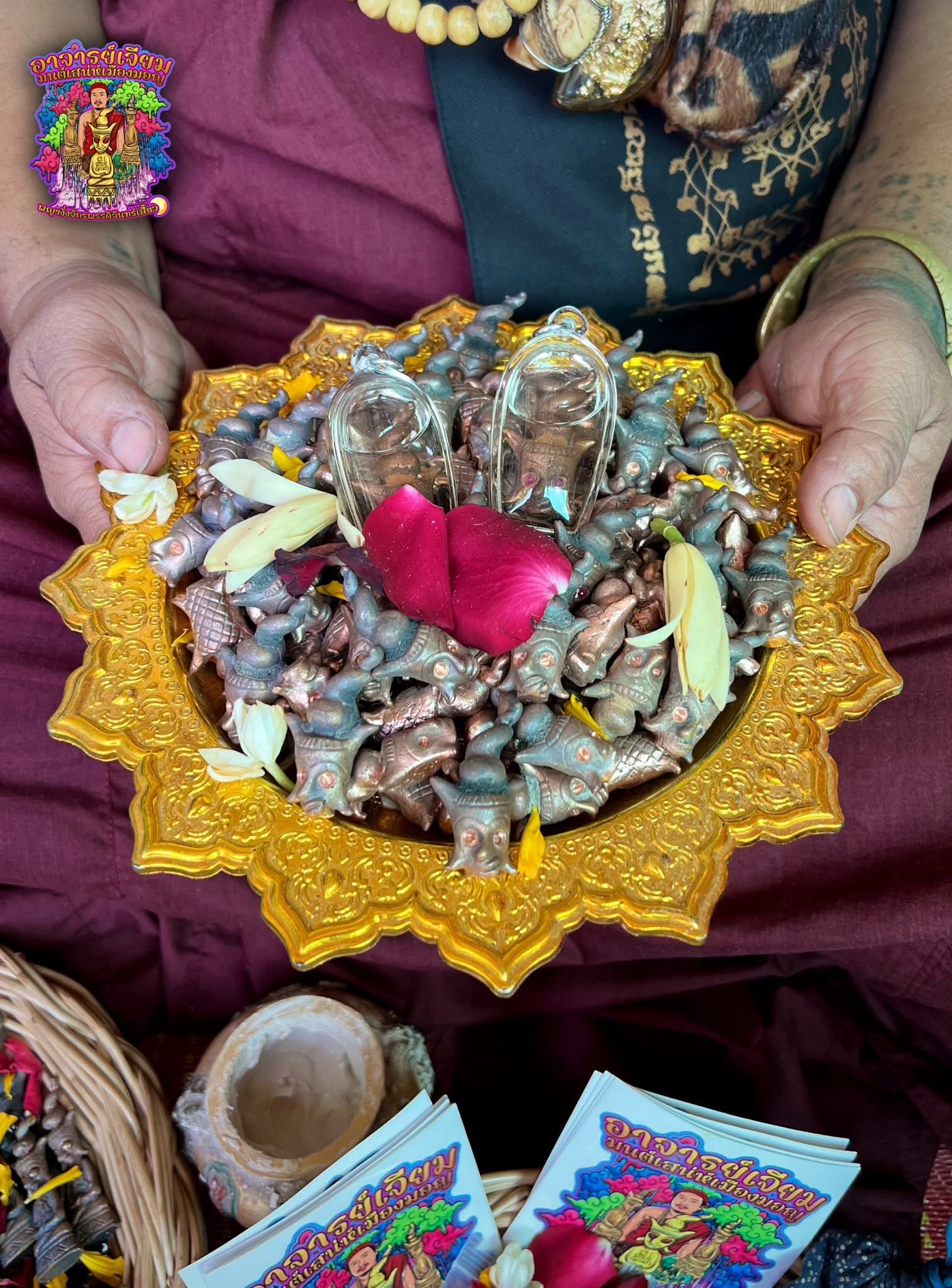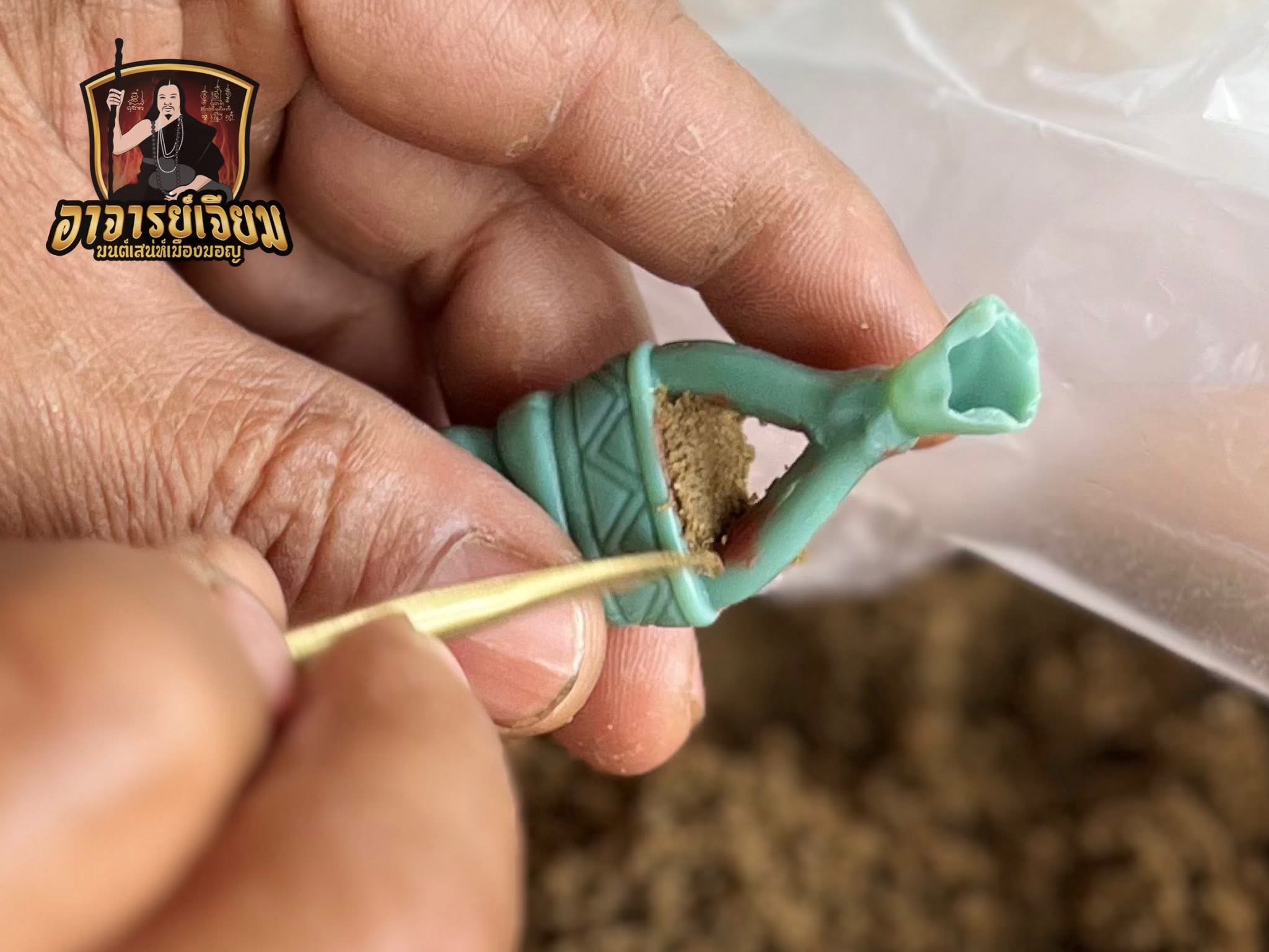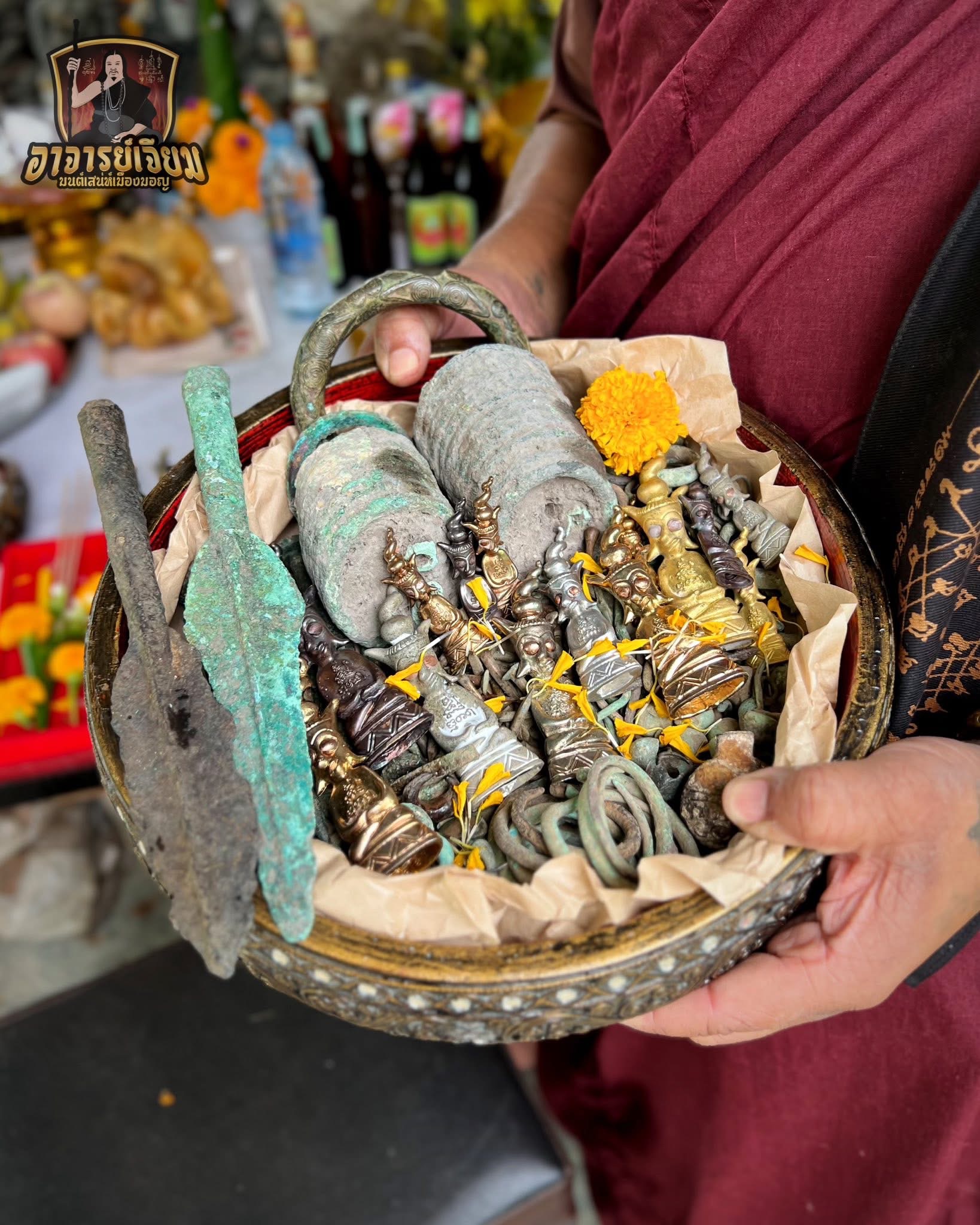 Arjarn Jiam performed a ceremonial offering and homage to the lineage of master teachers and ancestors who had created sacred objects since ancient times, from the Ayutthaya period, through Thonburi, and into the Rattanakosin era, including his present-day teachers. The purpose of the ritual was to request permission to consecrate and repurpose broken fragments of Phra Chai amulets (Phra Ngang Ayutthaya), which were then ground into sacred powder and mixed with various mystical herbs. This sacred mixture would later be used to fill the base of the Phaya Ngang Chakrapat Jan Siao (Crescent Moon Emperor Ngang).