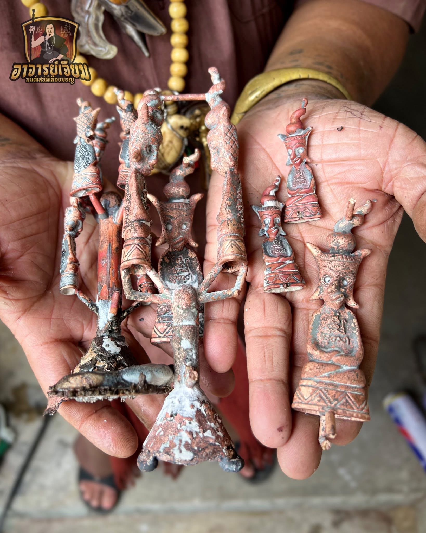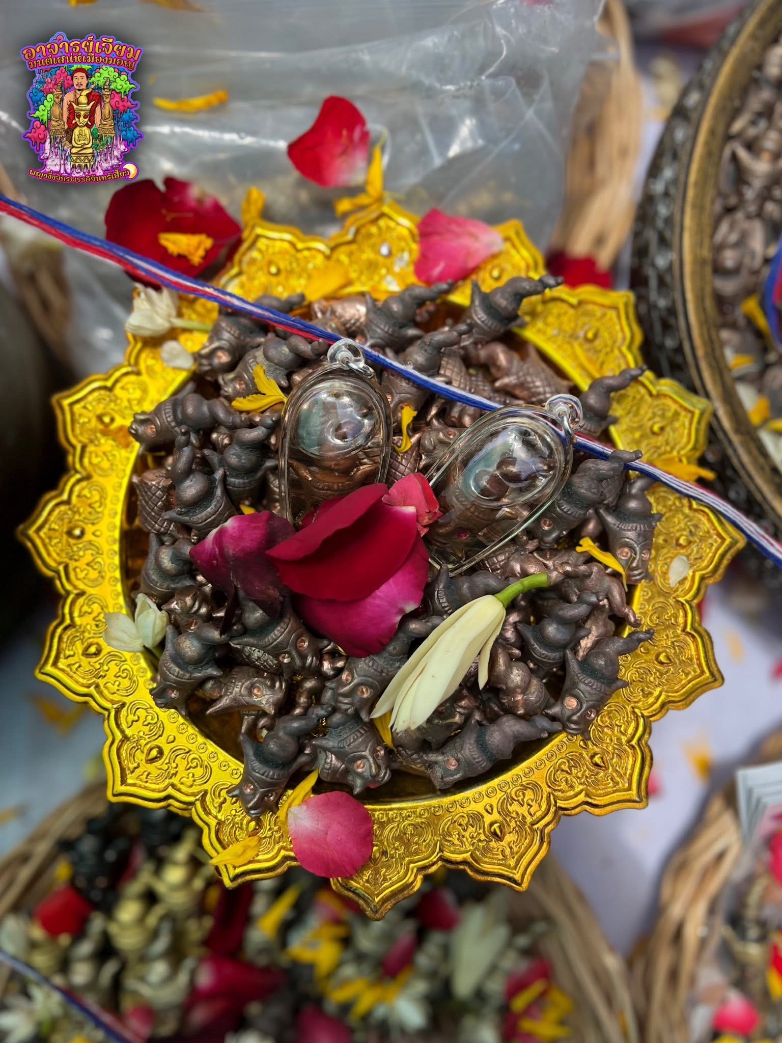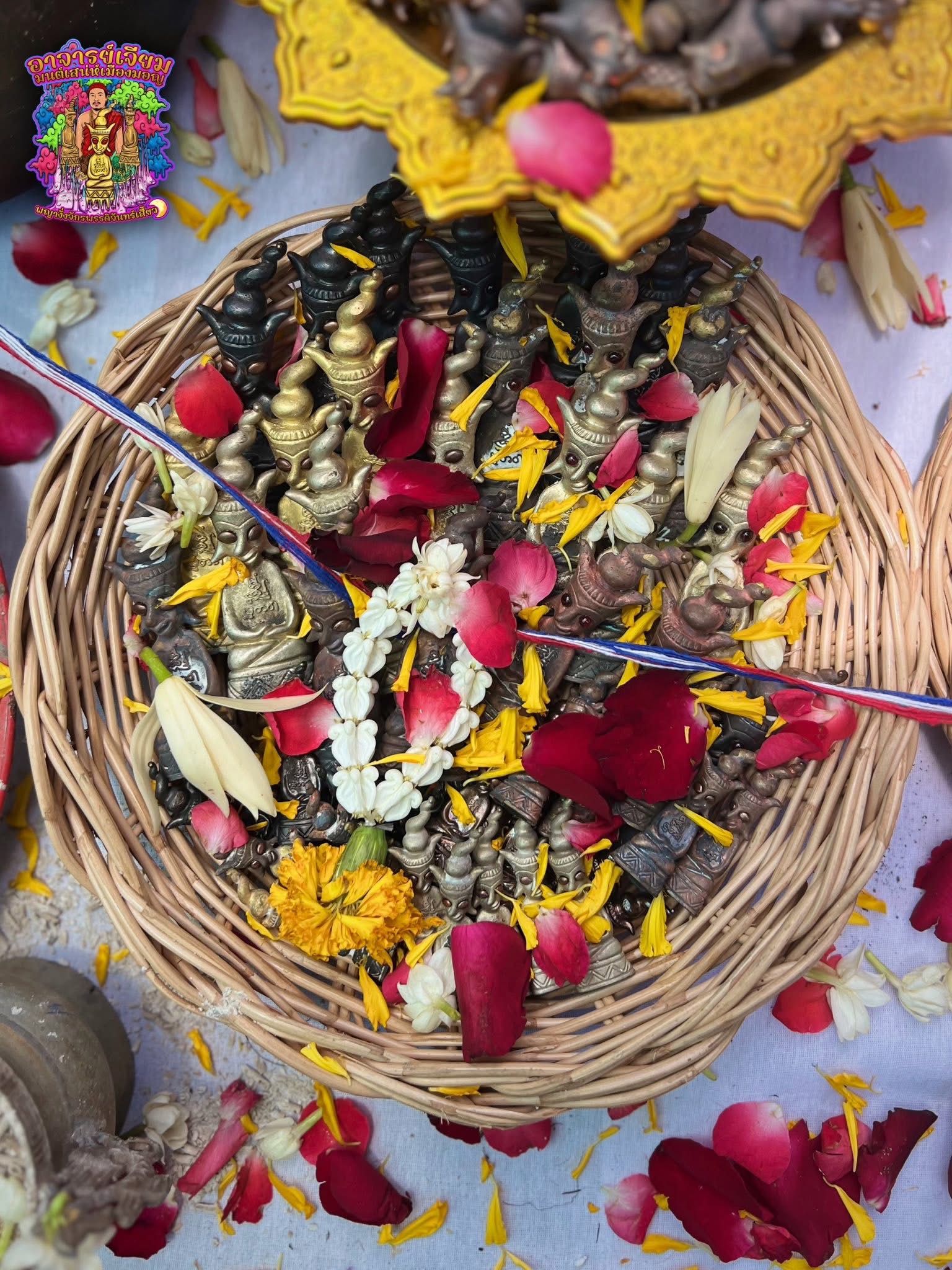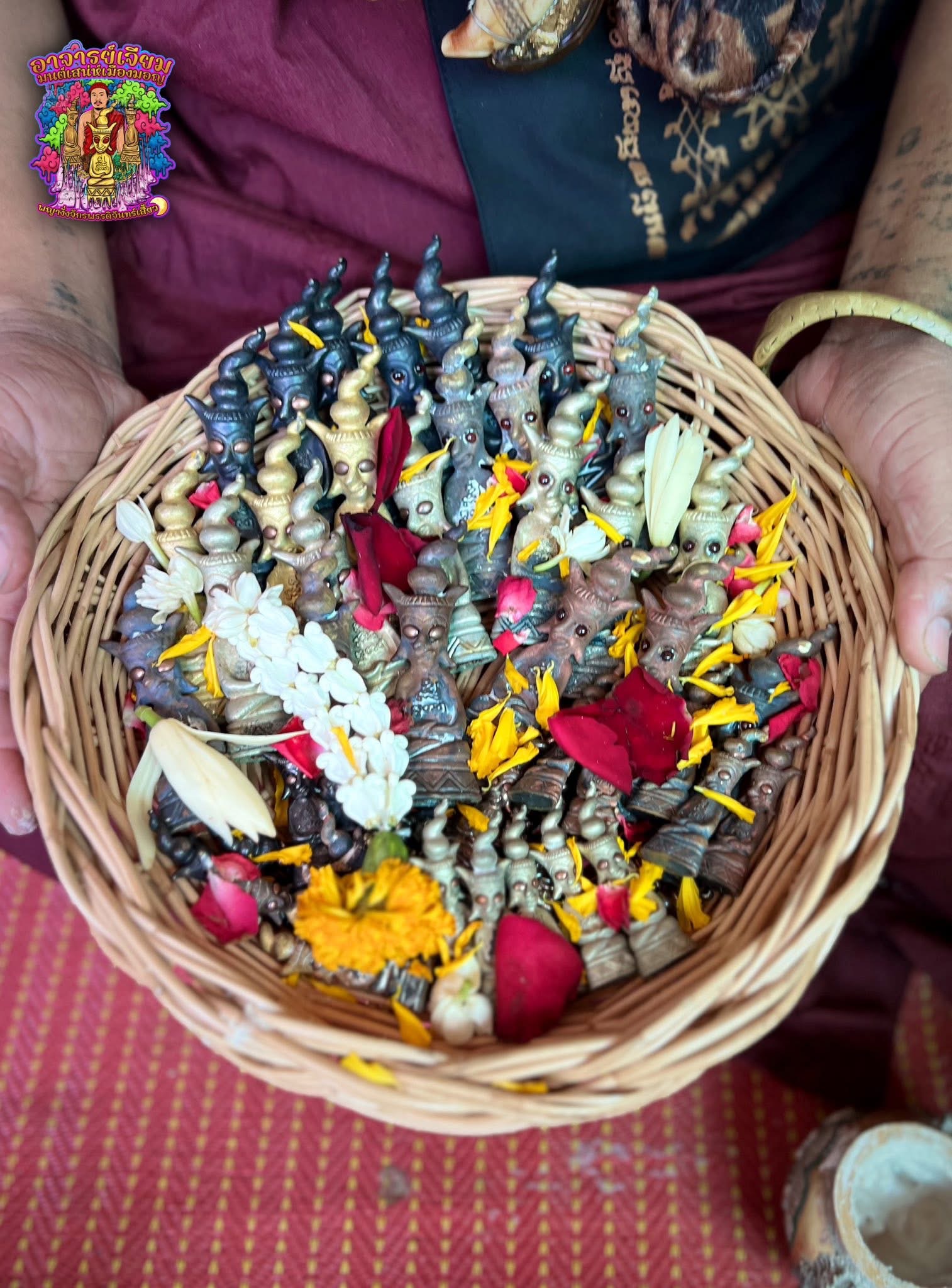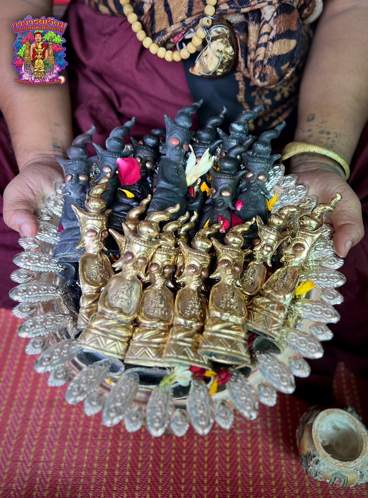Arjarn Jiam performed a ceremonial offering and homage to the lineage of master teachers and ancestors who had created sacred objects since ancient times, from the Ayutthaya period, through Thonburi, and into the Rattanakosin era, including his present-day teachers. The purpose of the ritual was to request permission to consecrate and repurpose broken fragments of Phra Chai amulets (Phra Ngang Ayutthaya), which were then ground into sacred powder and mixed with various mystical herbs. This sacred mixture would later be used to fill the base of the Phaya Ngang Chakrapat Jan Siao (Crescent Moon Emperor Ngang).