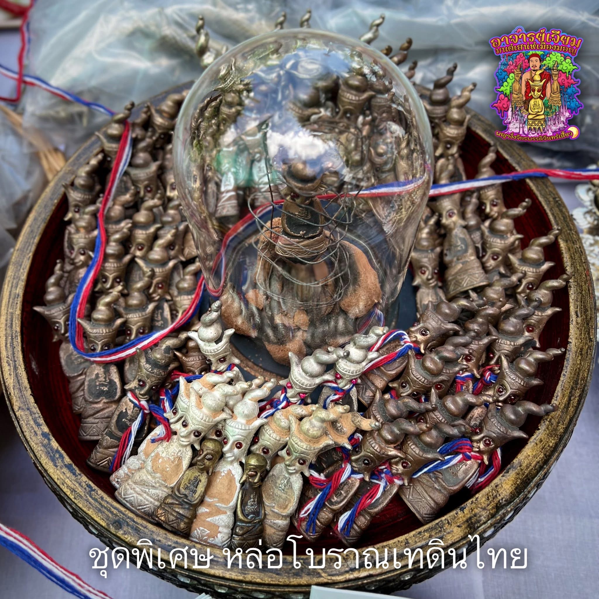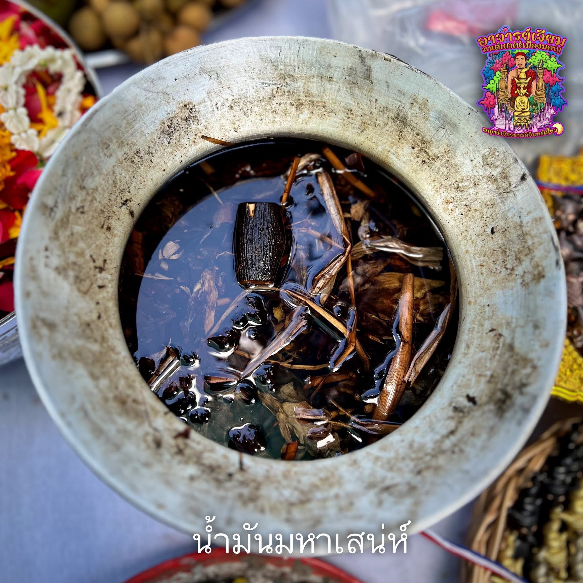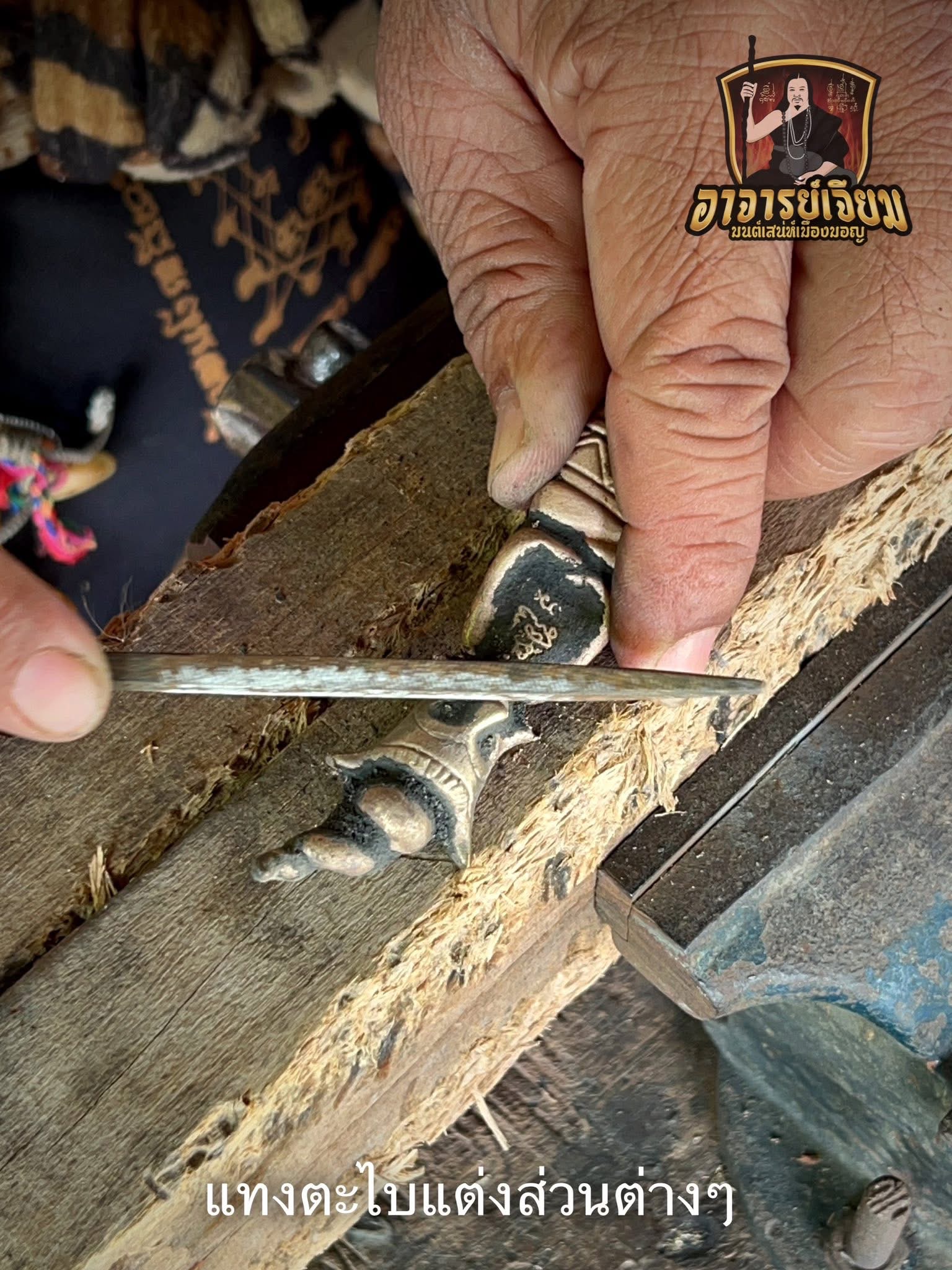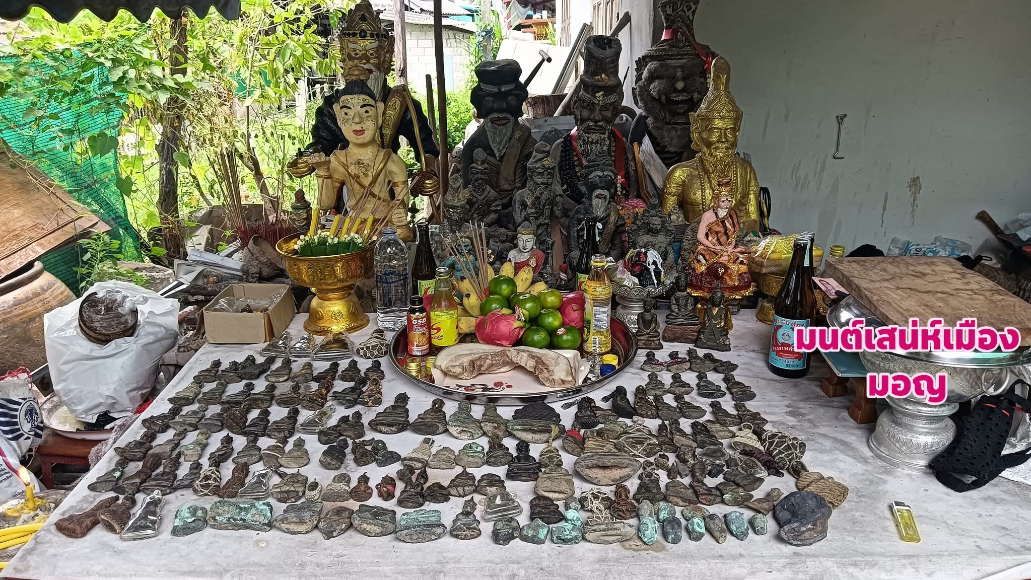 Arjarn Jiam performed a ceremonial offering and homage to the lineage of master teachers and ancestors who had created sacred objects since ancient times, from the Ayutthaya period, through Thonburi, and into the Rattanakosin era, including his present-day teachers. The purpose of the ritual was to request permission to consecrate and repurpose broken fragments of Phra Chai amulets (Phra Ngang Ayutthaya), which were then ground into sacred powder and mixed with various mystical herbs. This sacred mixture would later be used to fill the base of the Phaya Ngang Chakrapat Jan Siao (Crescent Moon Emperor Ngang).