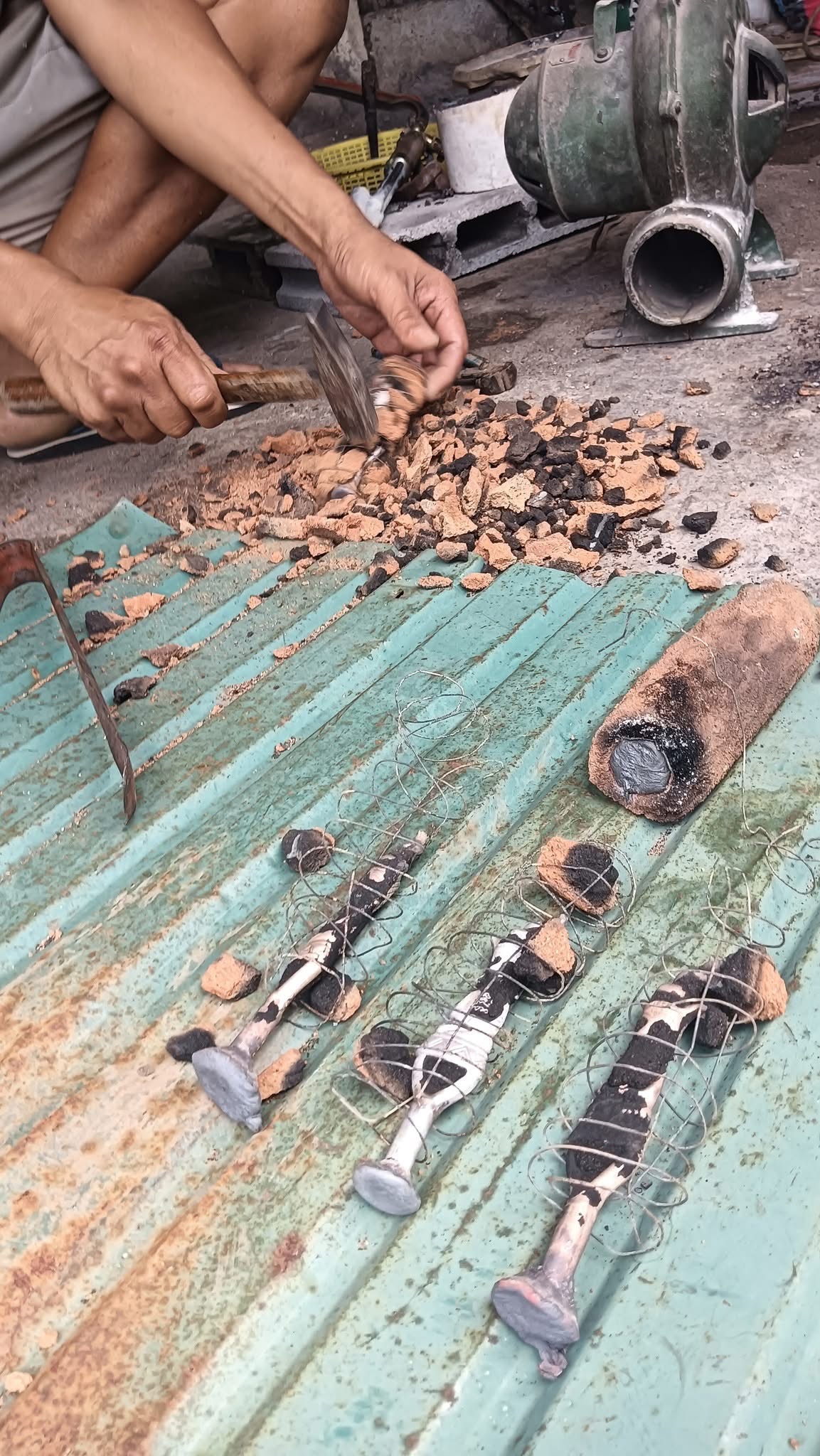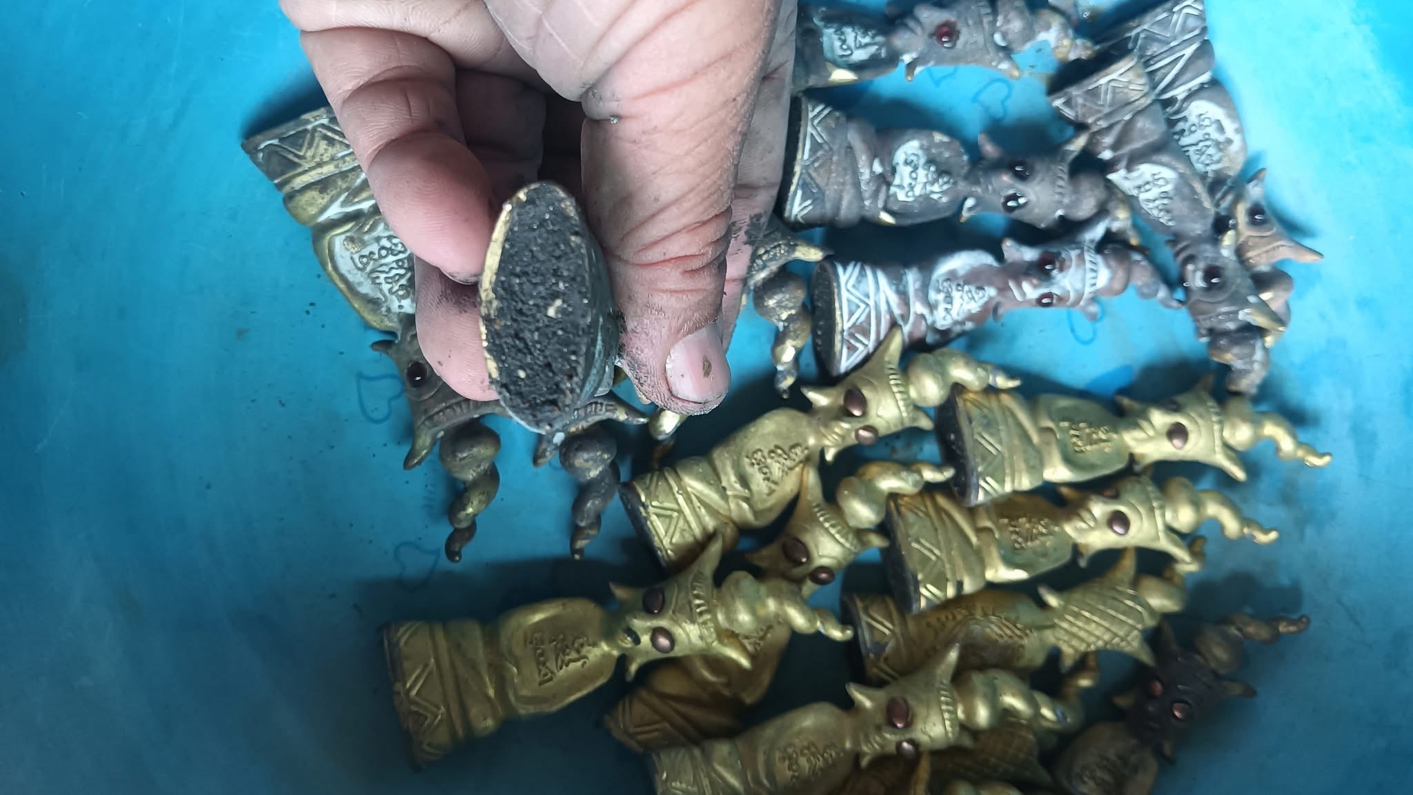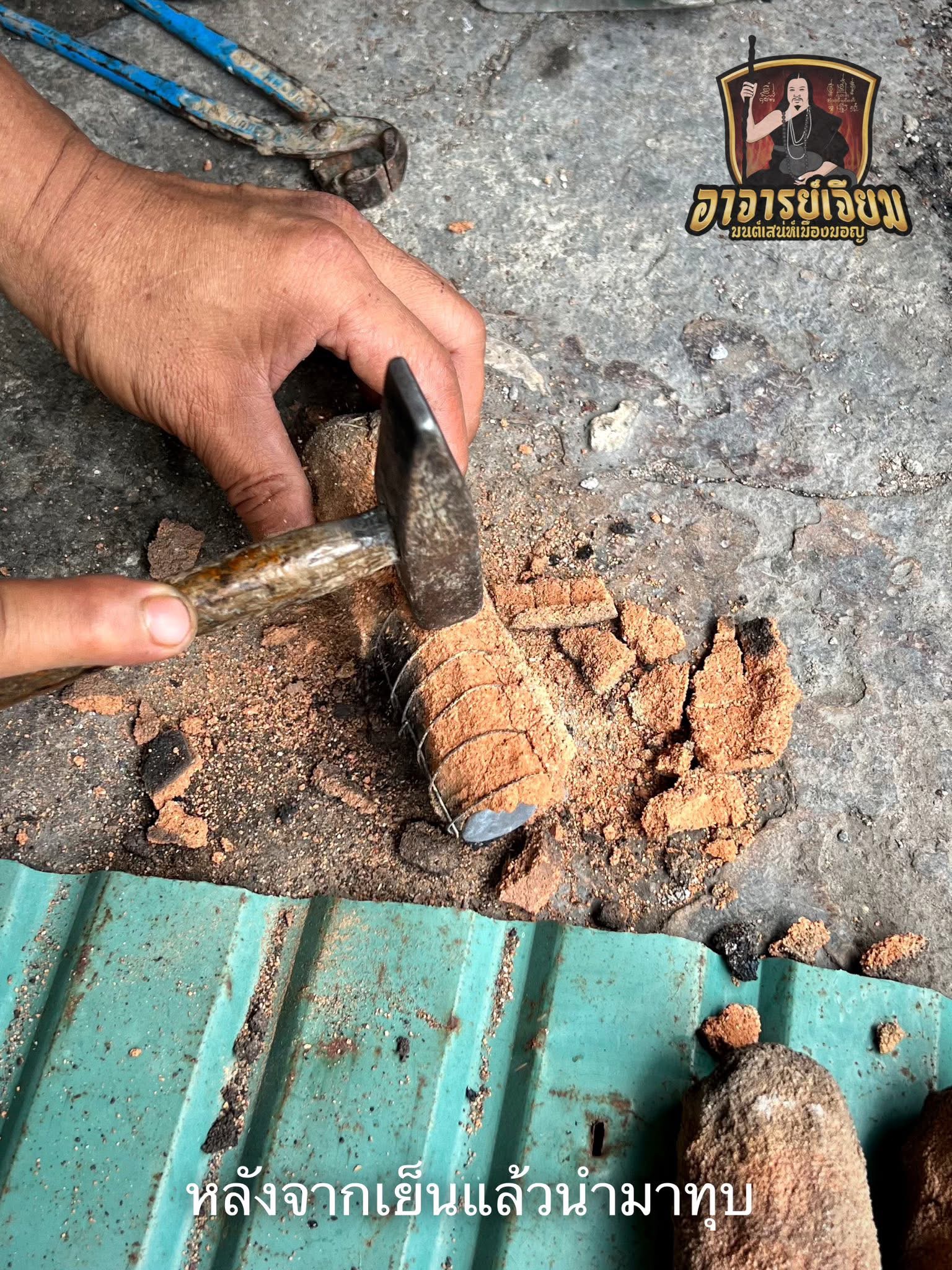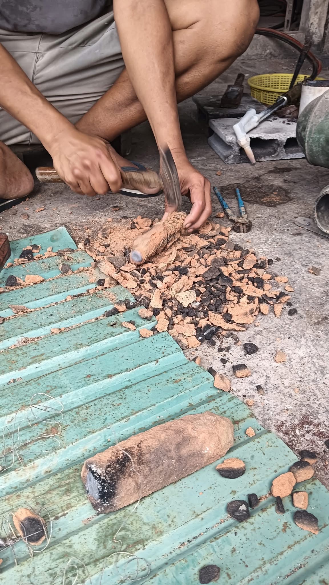 After the bronze was poured, the mold was left to cool gradually. This step differs significantly from modern casting methods such as vacuum casting or centrifugal casting. In modern techniques, once the molten metal is poured and the mold begins to cool, the mold can be submerged in water and cleaned almost immediately. However, in the traditional Thai "Din Thai" earthen mold casting method, the mold must be left to cool naturally. A fan may be used to help speed up the cooling process, but the mold cannot be submerged in water. Once the mold is sufficiently cooled, it is carefully broken open using a hammer to reveal the cast figure inside. Even after the figure is removed, it cannot be washed with water, because the coating of fine clay mixed with cow dung (which has now been burnt into a blackened layer) would immediately be washed off, erasing its unique texture and appearance. Therefore, once all the earthen mold material is removed, the next step is to carefully clean and refine the surface of the cast figure.