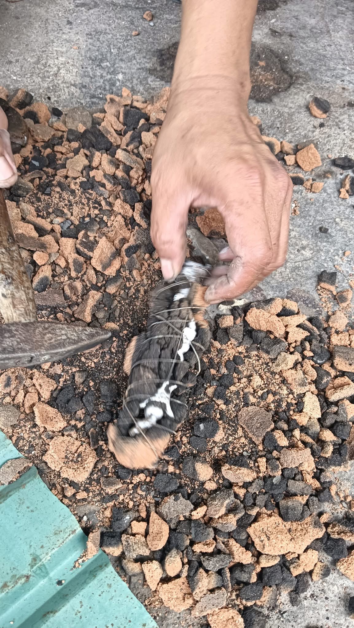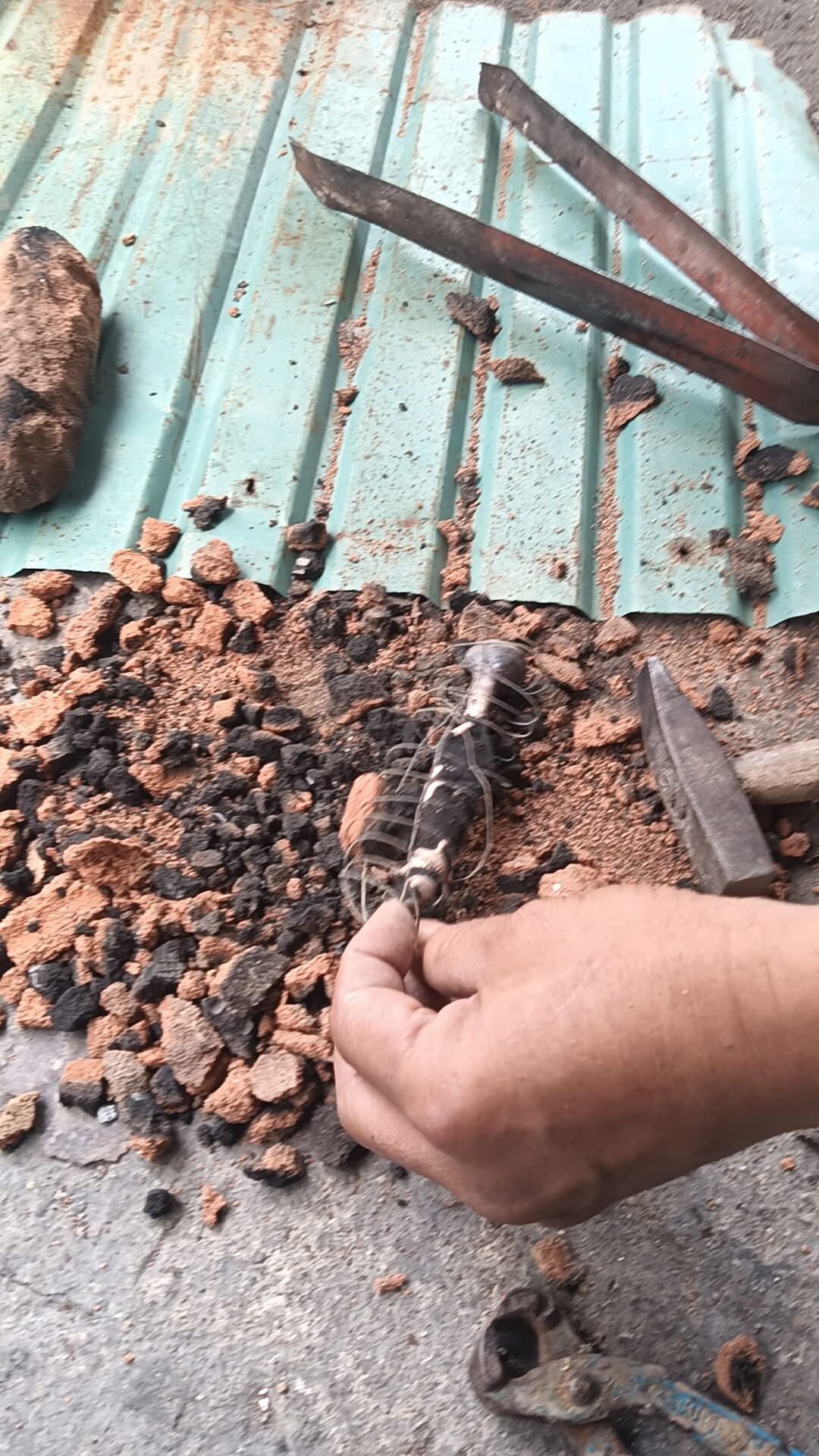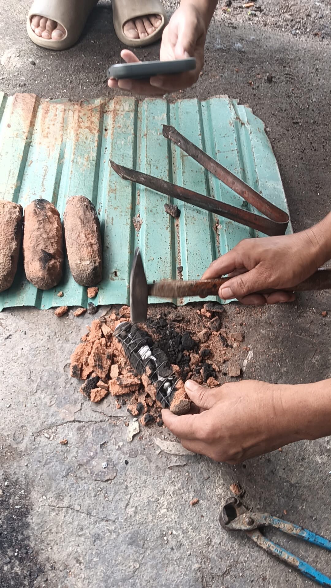 After the bronze was poured, the mold was left to cool gradually. This step differs significantly from modern casting methods such as vacuum casting or centrifugal casting. In modern techniques, once the molten metal is poured and the mold begins to cool, the mold can be submerged in water and cleaned almost immediately. However, in the traditional Thai "Din Thai" earthen mold casting method, the mold must be left to cool naturally. A fan may be used to help speed up the cooling process, but the mold cannot be submerged in water. Once the mold is sufficiently cooled, it is carefully broken open using a hammer to reveal the cast figure inside. Even after the figure is removed, it cannot be washed with water, because the coating of fine clay mixed with cow dung (which has now been burnt into a blackened layer) would immediately be washed off, erasing its unique texture and appearance. Therefore, once all the earthen mold material is removed, the next step is to carefully clean and refine the surface of the cast figure.