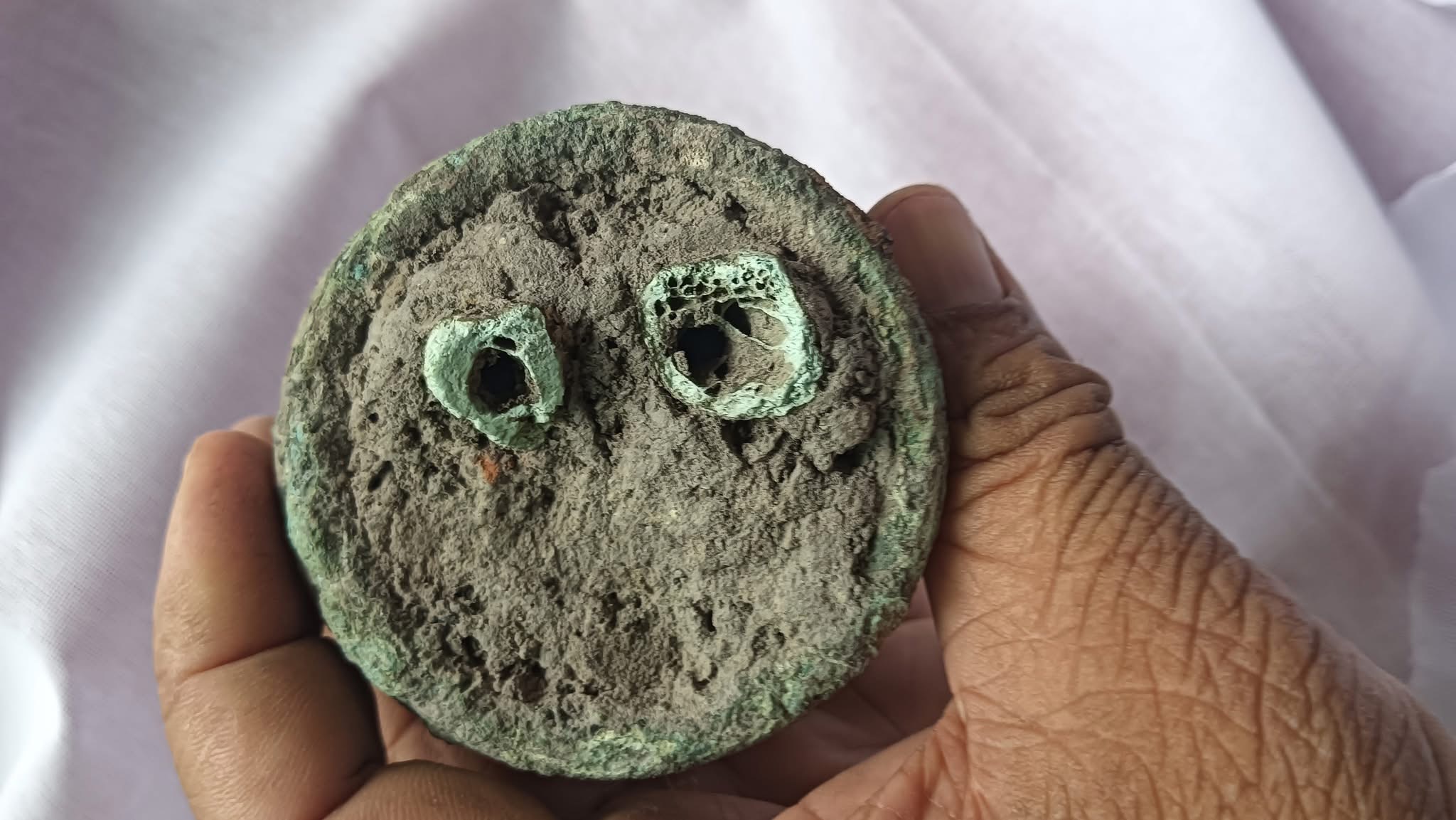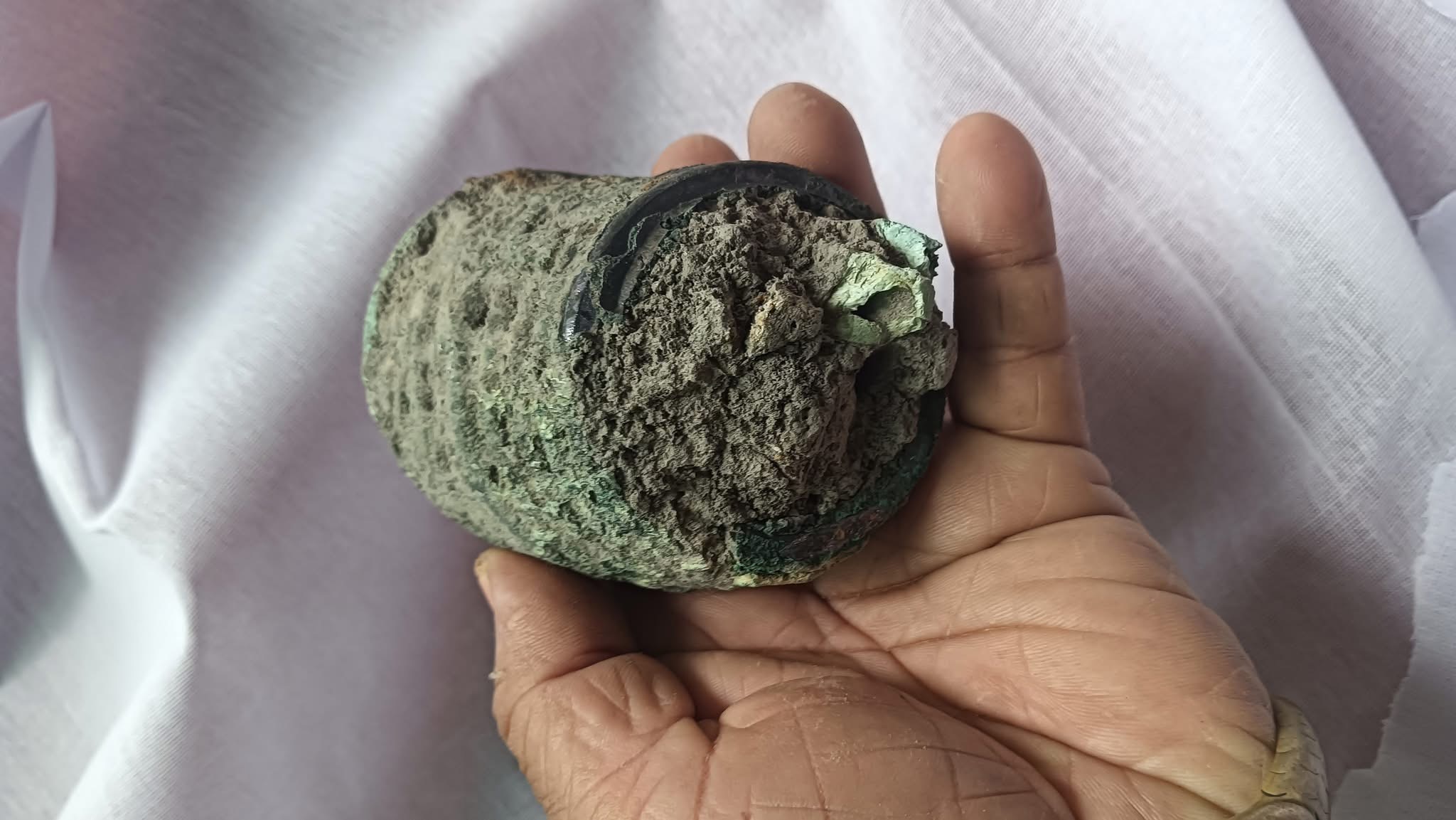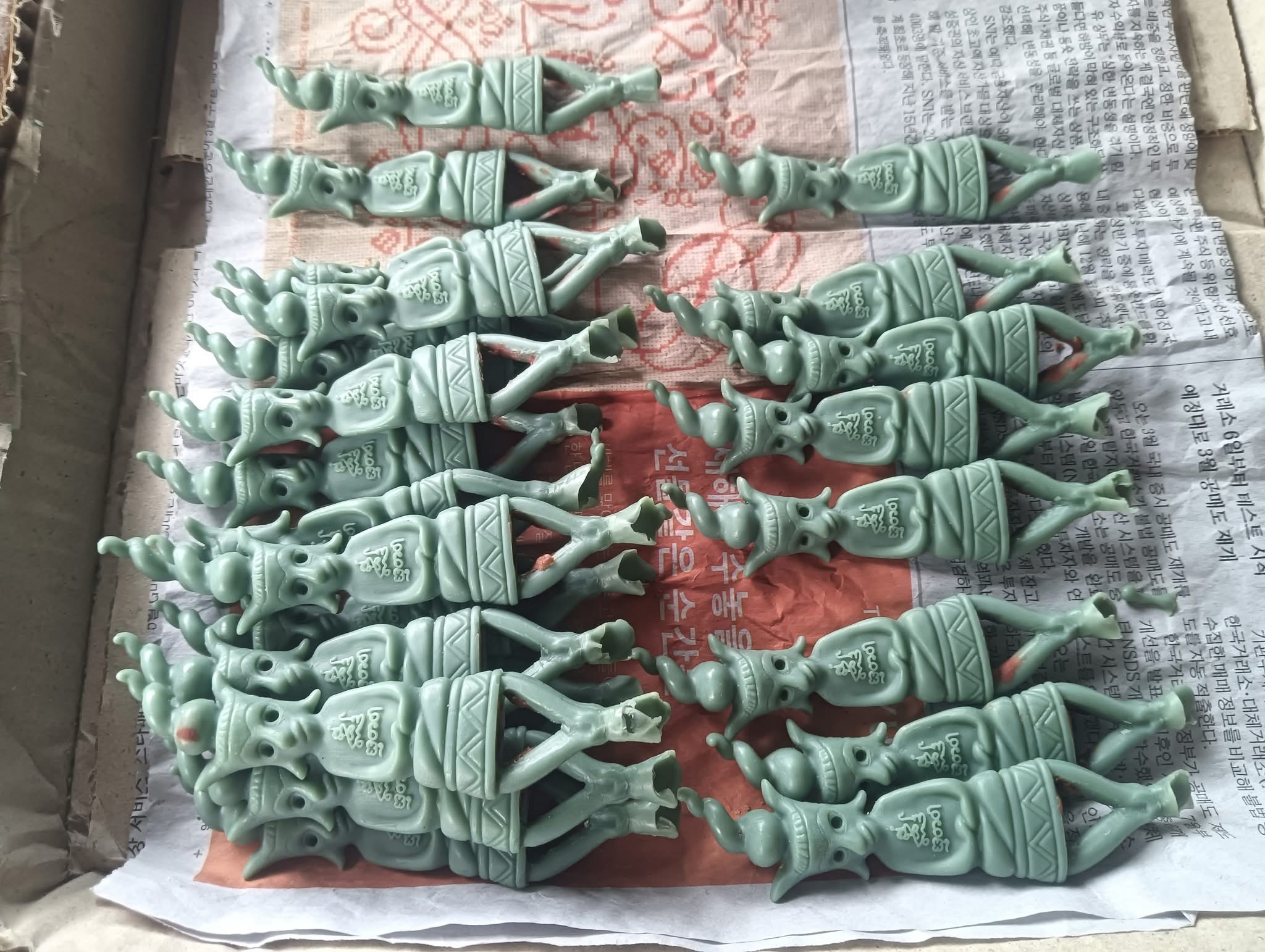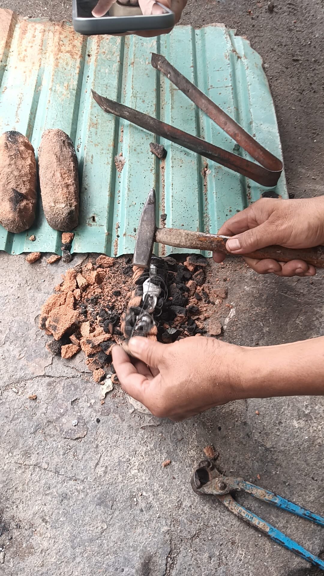 After the bronze was poured, the mold was left to cool gradually. This step differs significantly from modern casting methods such as vacuum casting or centrifugal casting. In modern techniques, once the molten metal is poured and the mold begins to cool, the mold can be submerged in water and cleaned almost immediately. However, in the traditional Thai "Din Thai" earthen mold casting method, the mold must be left to cool naturally. A fan may be used to help speed up the cooling process, but the mold cannot be submerged in water. Once the mold is sufficiently cooled, it is carefully broken open using a hammer to reveal the cast figure inside. Even after the figure is removed, it cannot be washed with water, because the coating of fine clay mixed with cow dung (which has now been burnt into a blackened layer) would immediately be washed off, erasing its unique texture and appearance. Therefore, once all the earthen mold material is removed, the next step is to carefully clean and refine the surface of the cast figure.