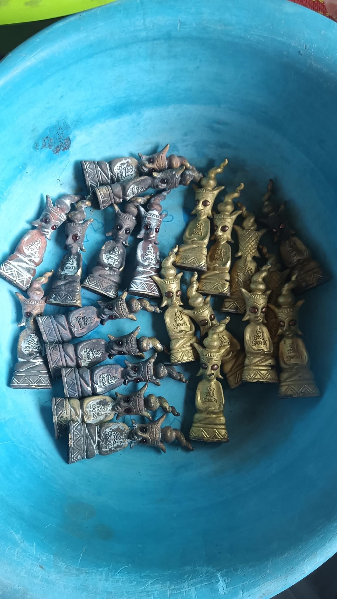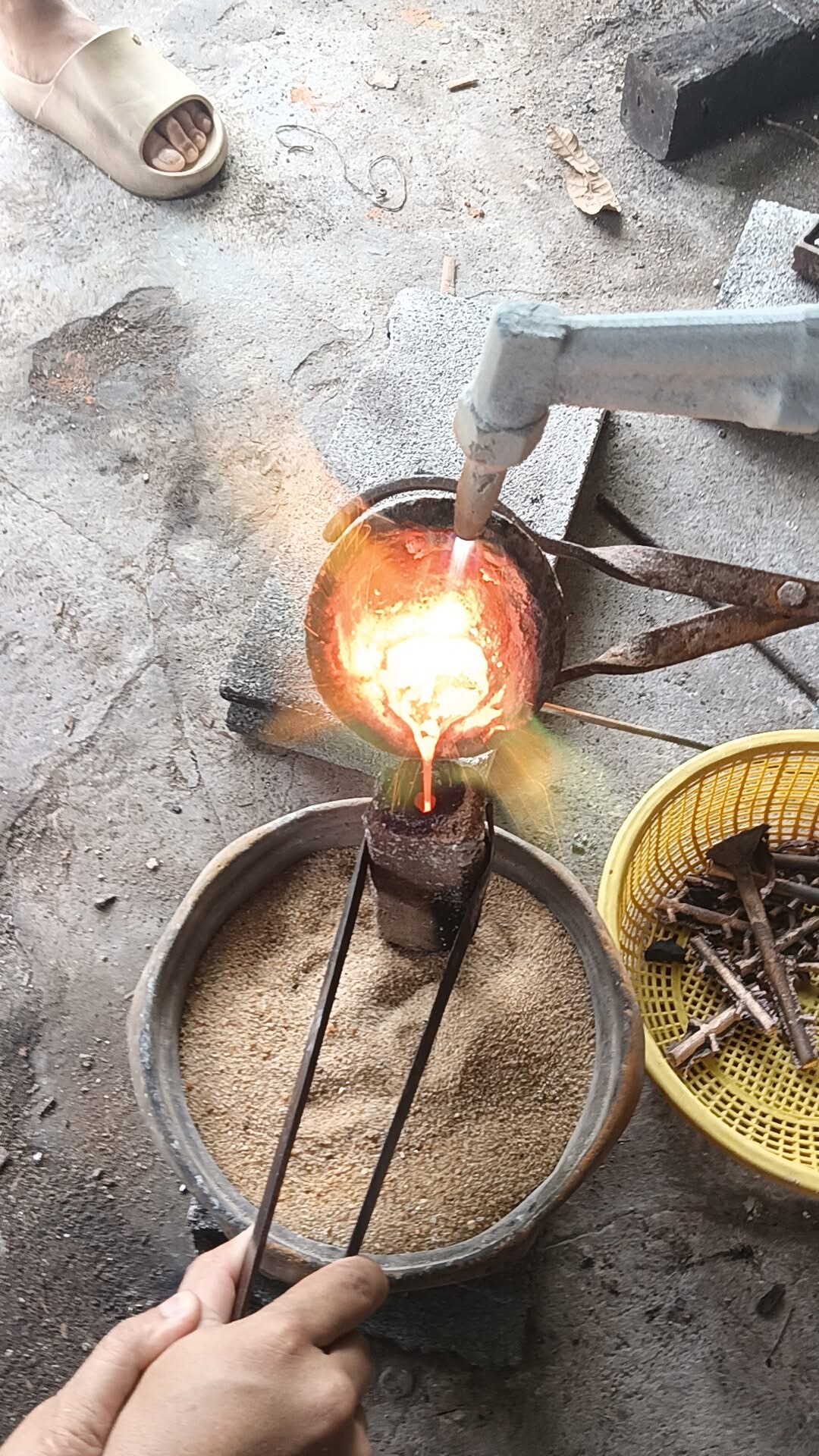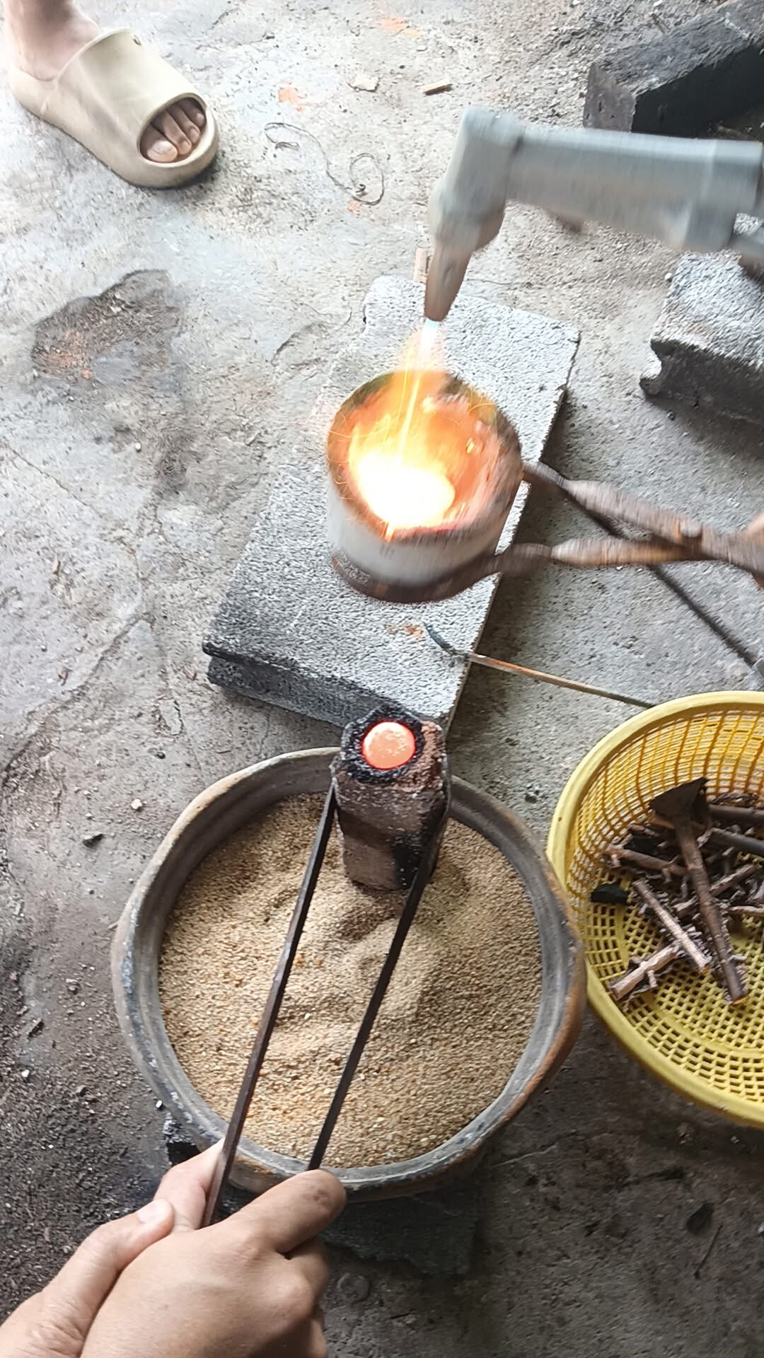 The casting process began with the silver. Pure silver pellets were melted together with hand-inscribed yantra sheets, ancient bronze, remnants of Arjarn Jiam's sacred objects, and previously melted monk medallions. Once the metals were fully fused, the molten mixture was poured into the molds. These molds were prepared using traditional methods, starting with a coating of cow dung mixed with fine clay. After that, layers of clay were applied to achieve the desired thickness. The molds were then left to dry under the sun. Each step in this traditional method requires time, care, and precision, especially the cow dung coating process, which must be applied layer by layer and allowed to dry completely between applications.