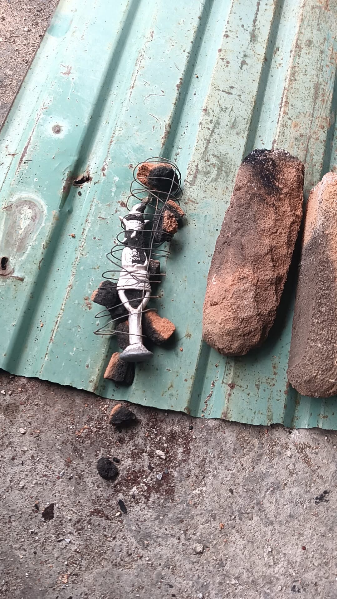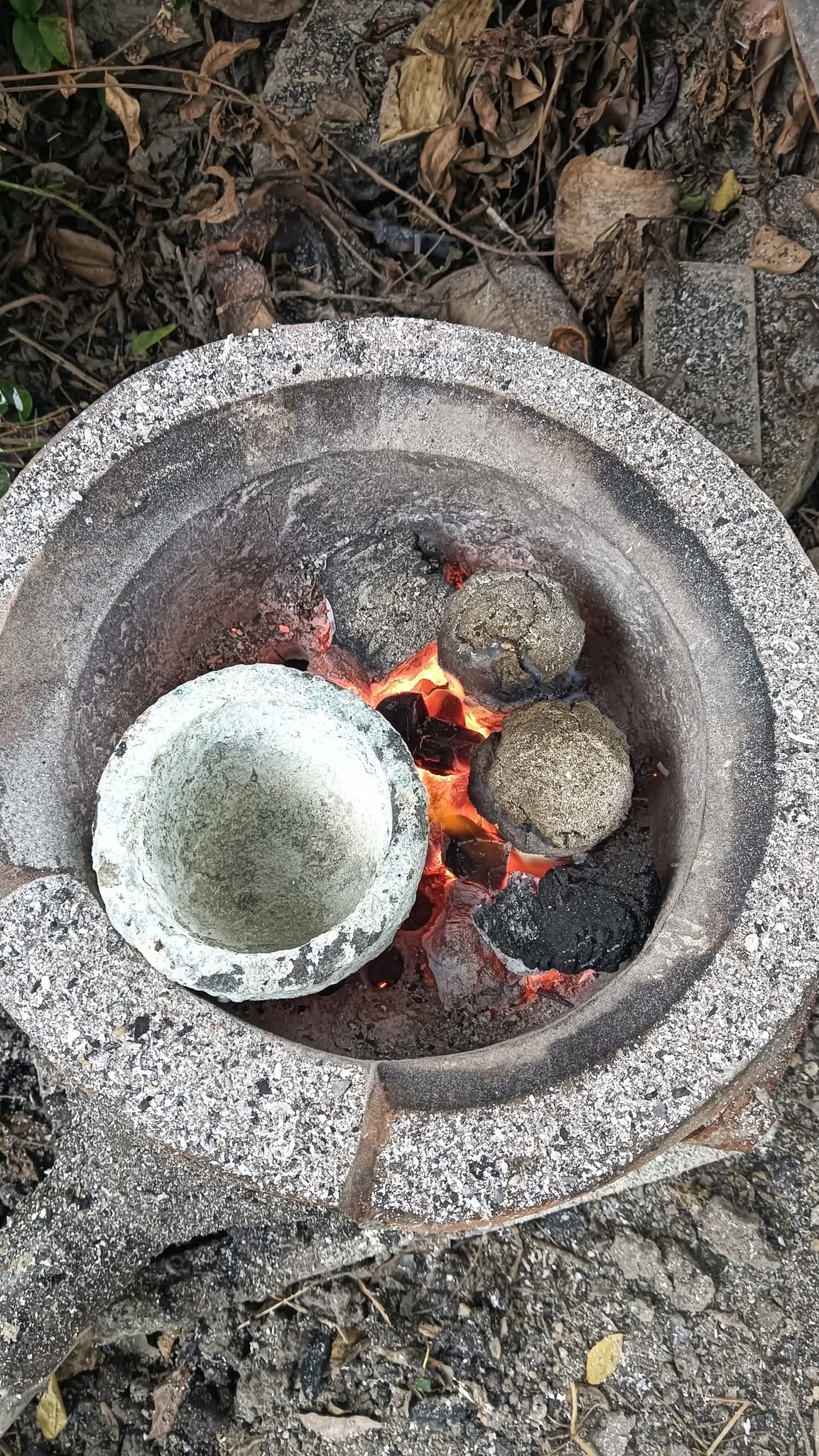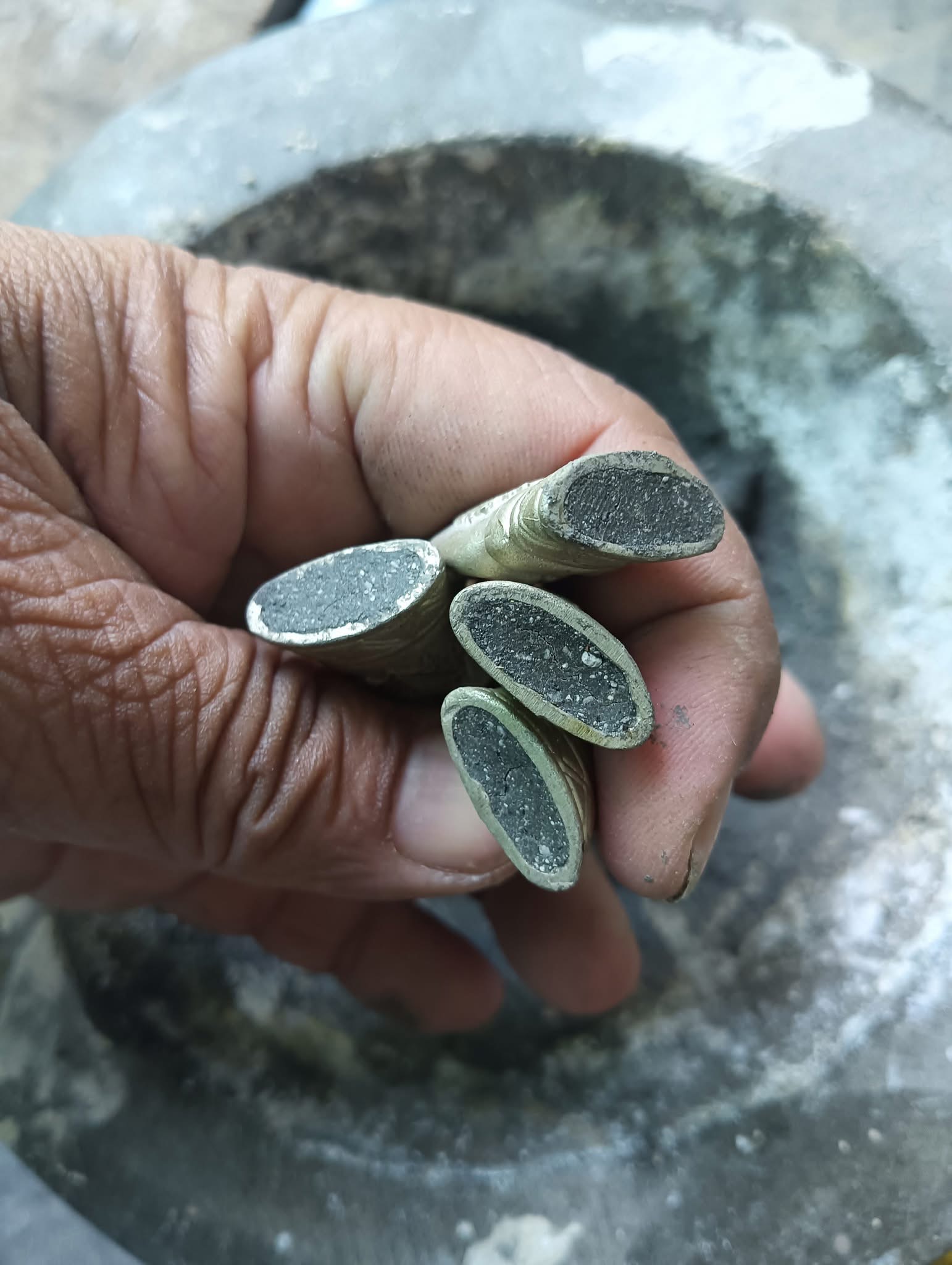 The casting process began with the silver. Pure silver pellets were melted together with hand-inscribed yantra sheets, ancient bronze, remnants of Arjarn Jiam's sacred objects, and previously melted monk medallions. Once the metals were fully fused, the molten mixture was poured into the molds. These molds were prepared using traditional methods, starting with a coating of cow dung mixed with fine clay. After that, layers of clay were applied to achieve the desired thickness. The molds were then left to dry under the sun. Each step in this traditional method requires time, care, and precision, especially the cow dung coating process, which must be applied layer by layer and allowed to dry completely between applications.