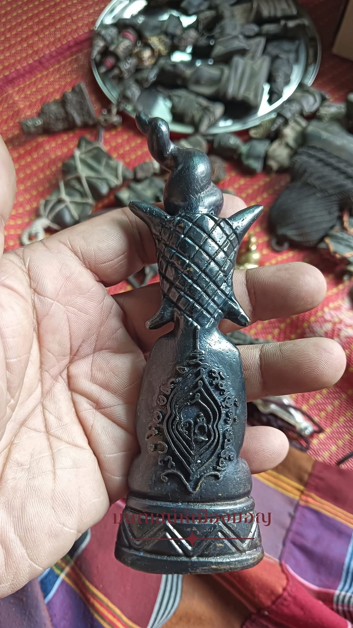 This traditional Thai earthen mold casting was carried out with special intention and care by Arjarn Jiam, as the Phaya Ngang Chakrapat Jan Siao (Crescent Moon Emperor Ngang) is considered by him to be the ultimate form of Phra Ngang, according to ancient texts. As described in the old scriptures: “Twisted topknot, crooked mouth, red eyes, long face, drooping ears, and a fishbone-like base, all marks of an authentic old-style Ngang".
