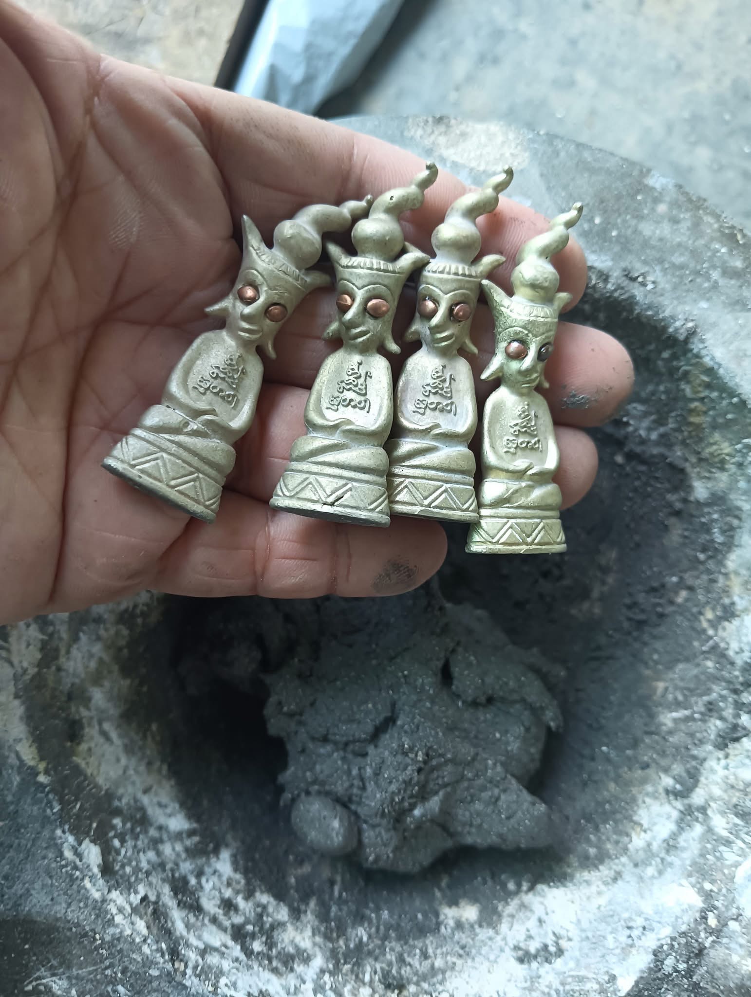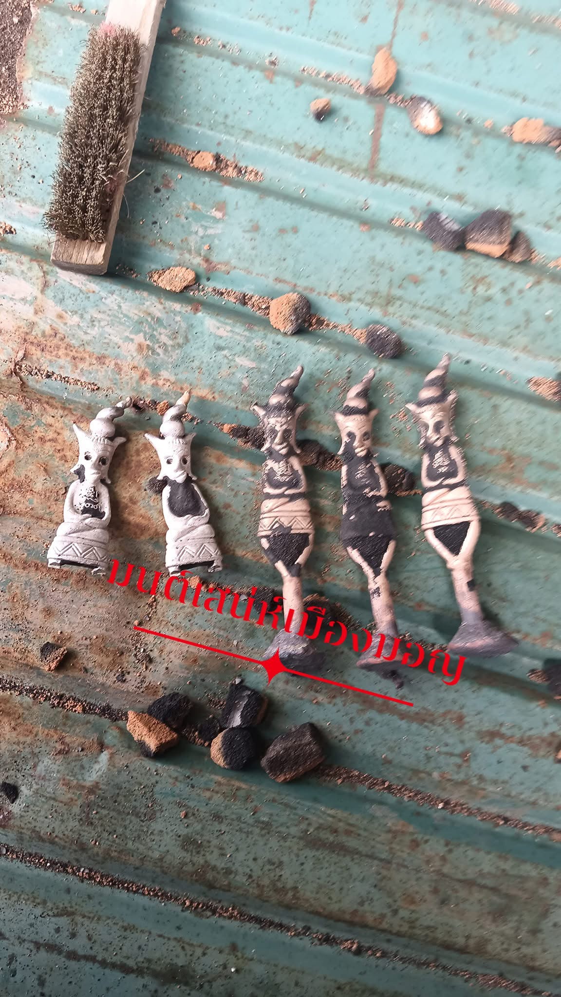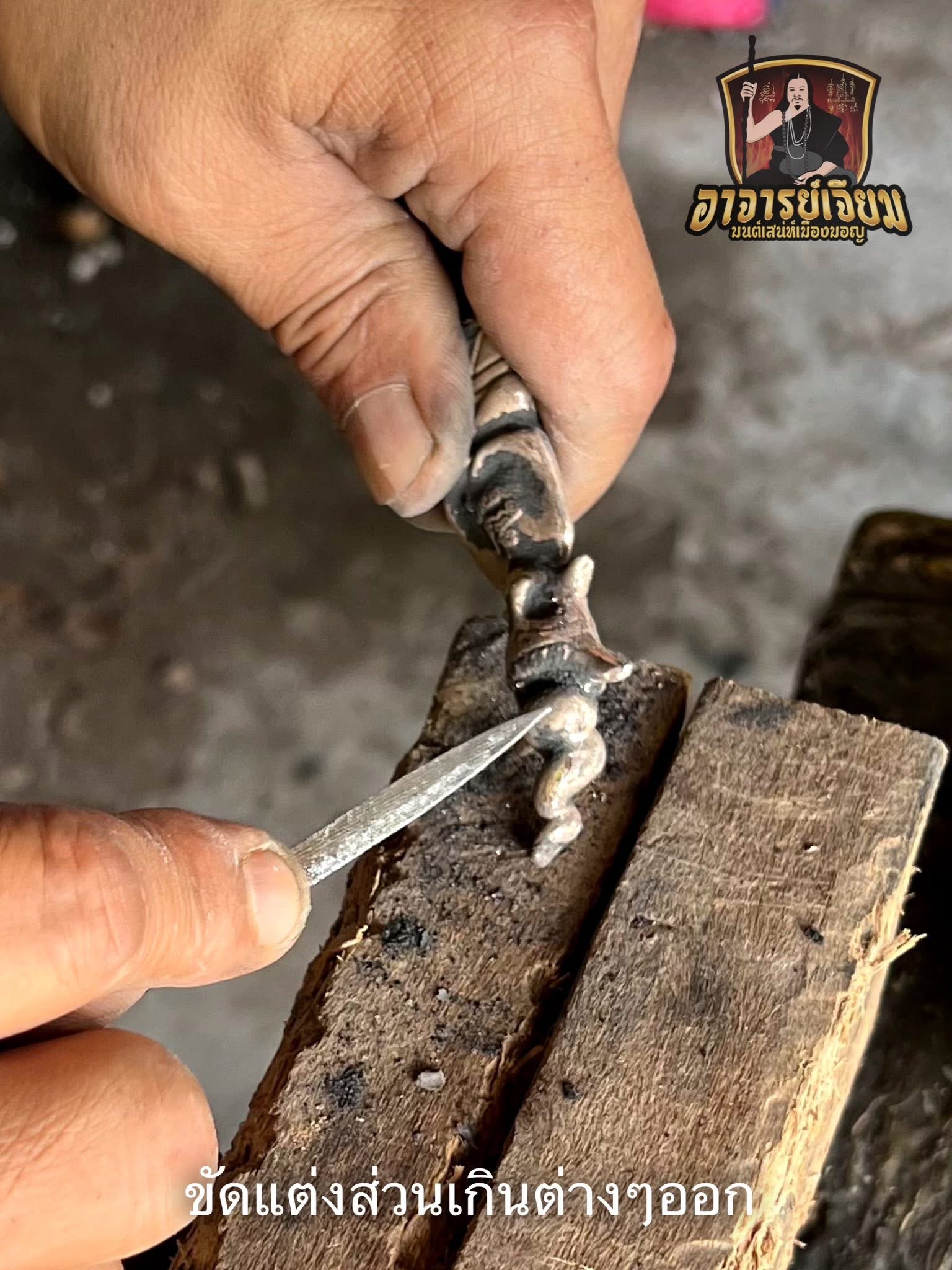 For the refinement of the cast figure, the chief artisan at the foundry first demonstrated how to properly clean and finish the surface. After observing, Arjarn Jiam personally tried his hand at refining the figure as well. Following the filing process to define the details, the next step involved machine grinding the base to ensure it was properly leveled. In this particular casting, Arjarn Jiam wished to preserve the traditional, ancient aesthetic, so the finishing was done only moderately, not polished to a completely smooth, modern finish. Areas where black Thai clay (Din Dam) remained on the surface were intentionally left untouched as much as possible, in order to retain the sacred and authentic character of traditional amulets. The final result came out just as intended, as seen in the accompanying photos.