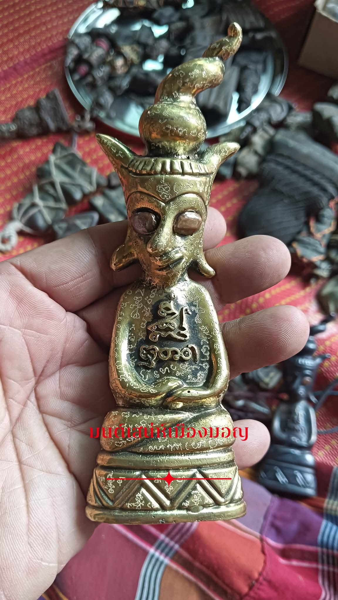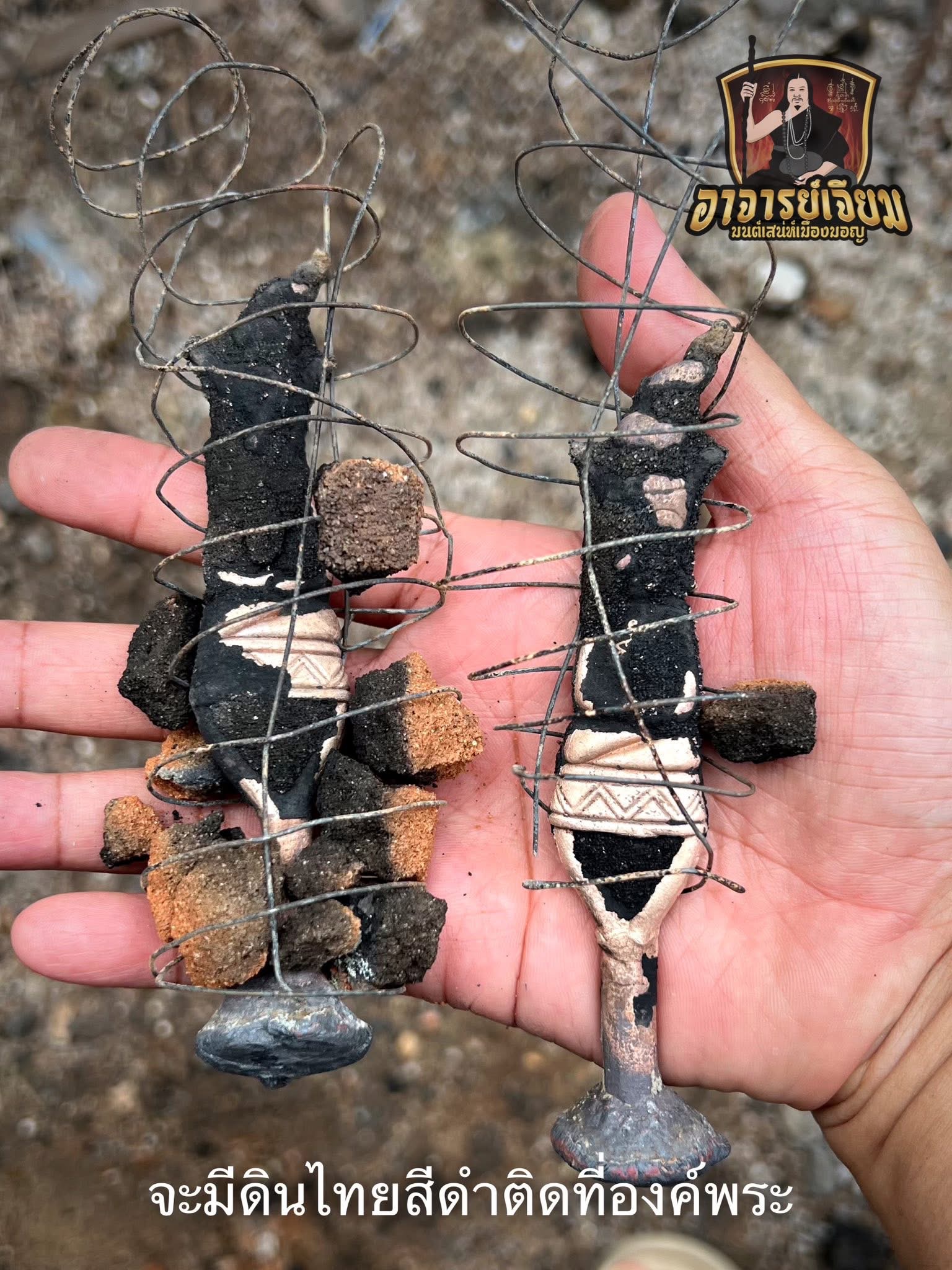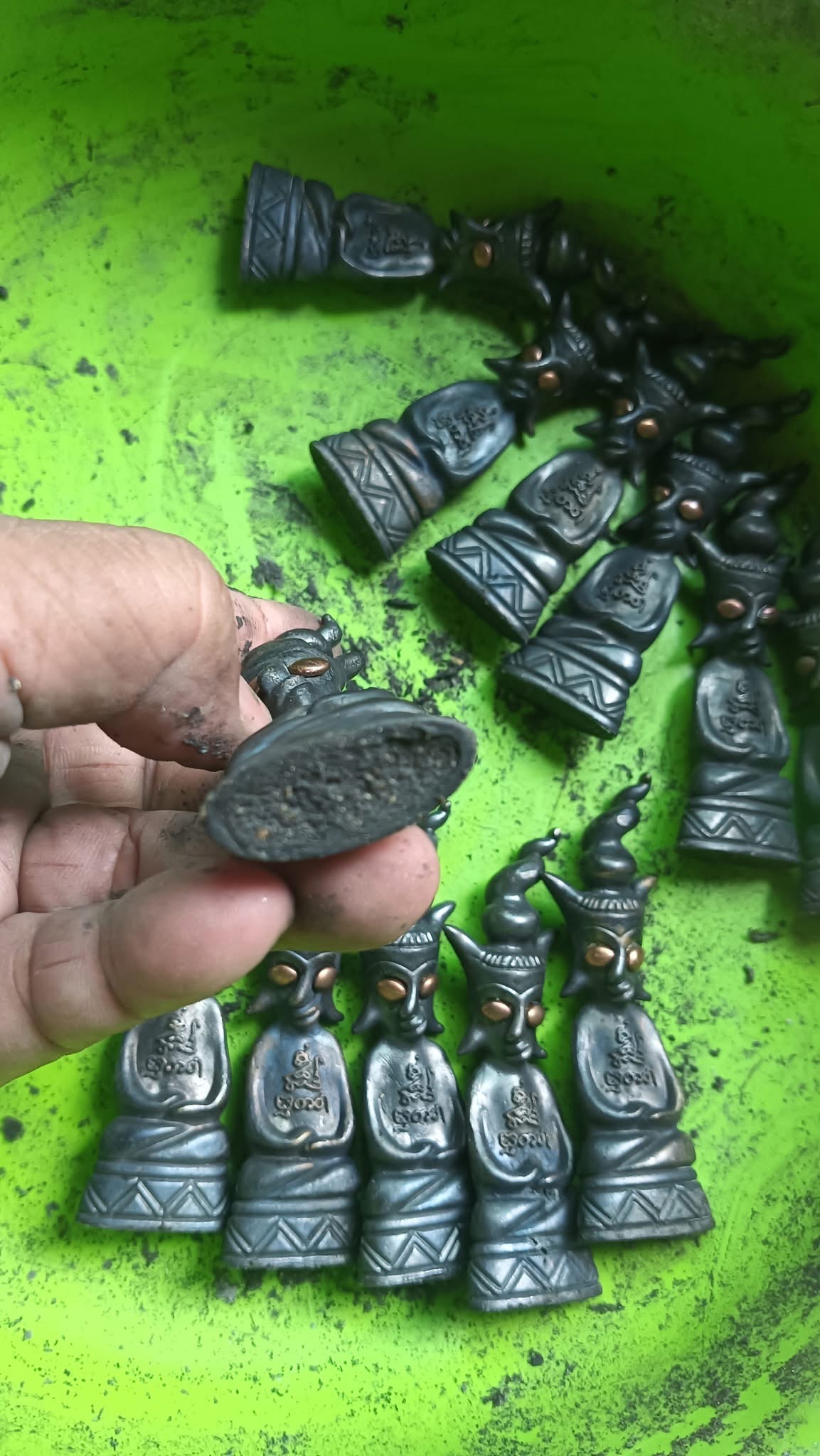 For the refinement of the cast figure, the chief artisan at the foundry first demonstrated how to properly clean and finish the surface. After observing, Arjarn Jiam personally tried his hand at refining the figure as well. Following the filing process to define the details, the next step involved machine grinding the base to ensure it was properly leveled. In this particular casting, Arjarn Jiam wished to preserve the traditional, ancient aesthetic, so the finishing was done only moderately, not polished to a completely smooth, modern finish. Areas where black Thai clay (Din Dam) remained on the surface were intentionally left untouched as much as possible, in order to retain the sacred and authentic character of traditional amulets. The final result came out just as intended, as seen in the accompanying photos.