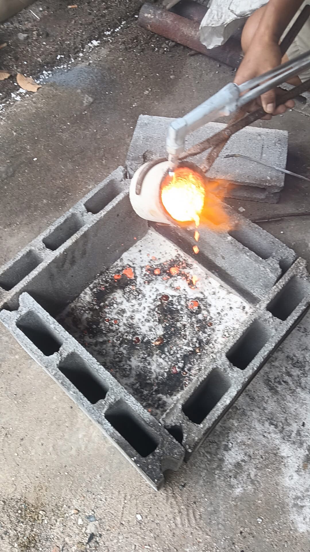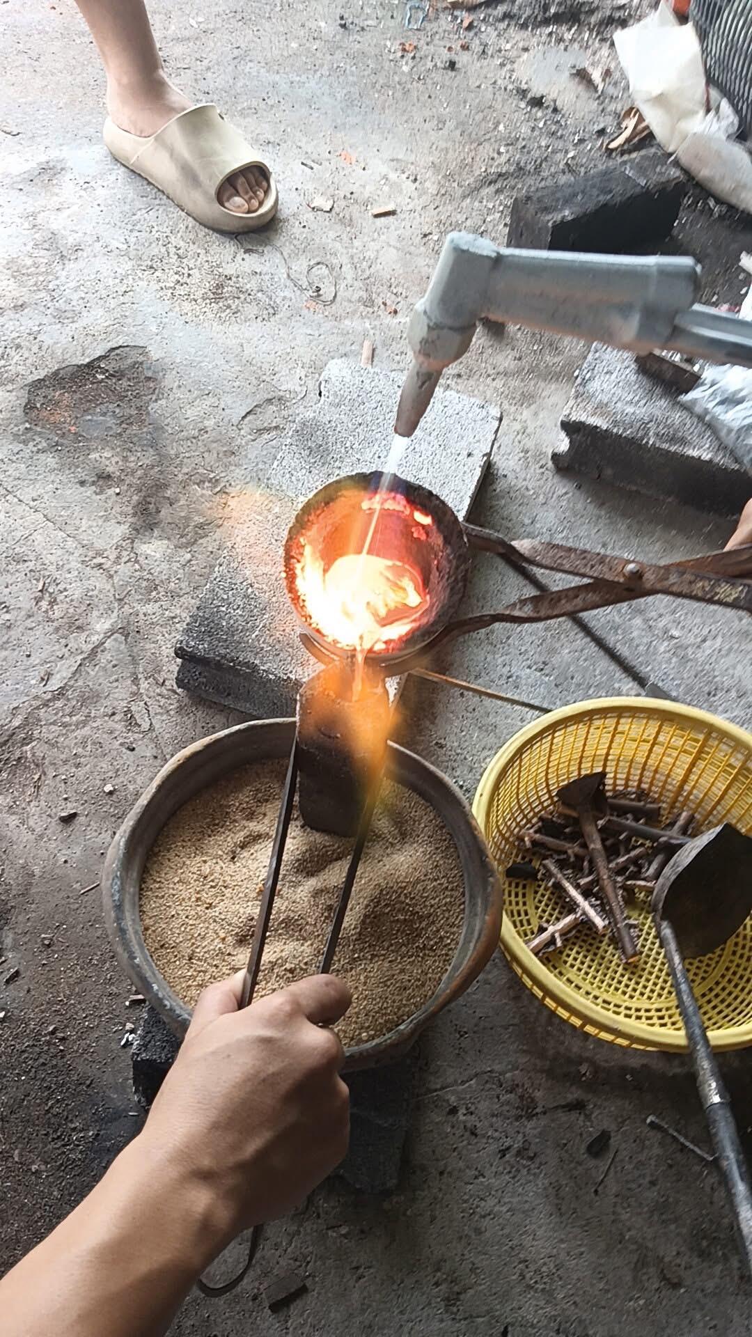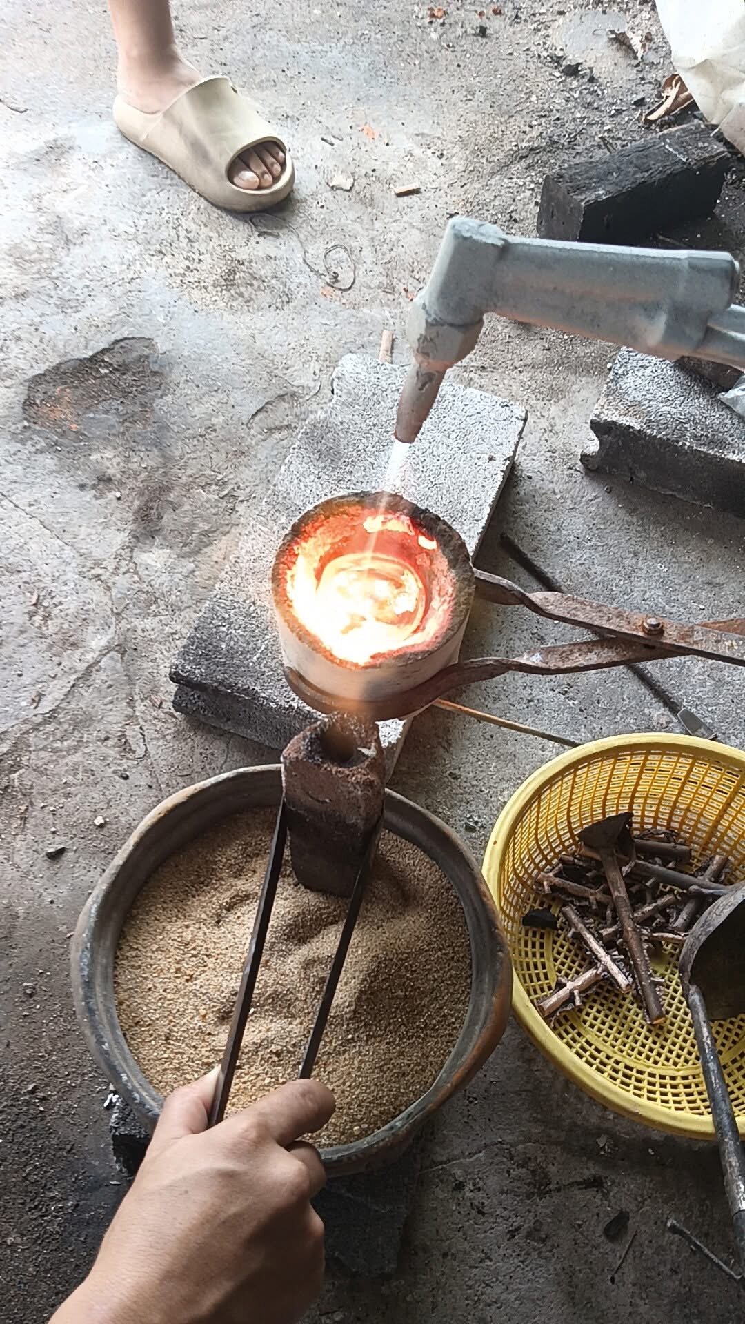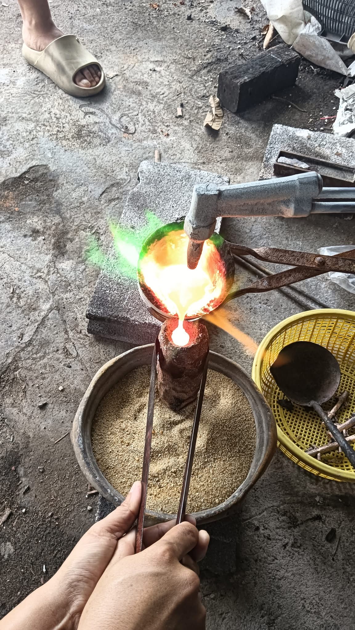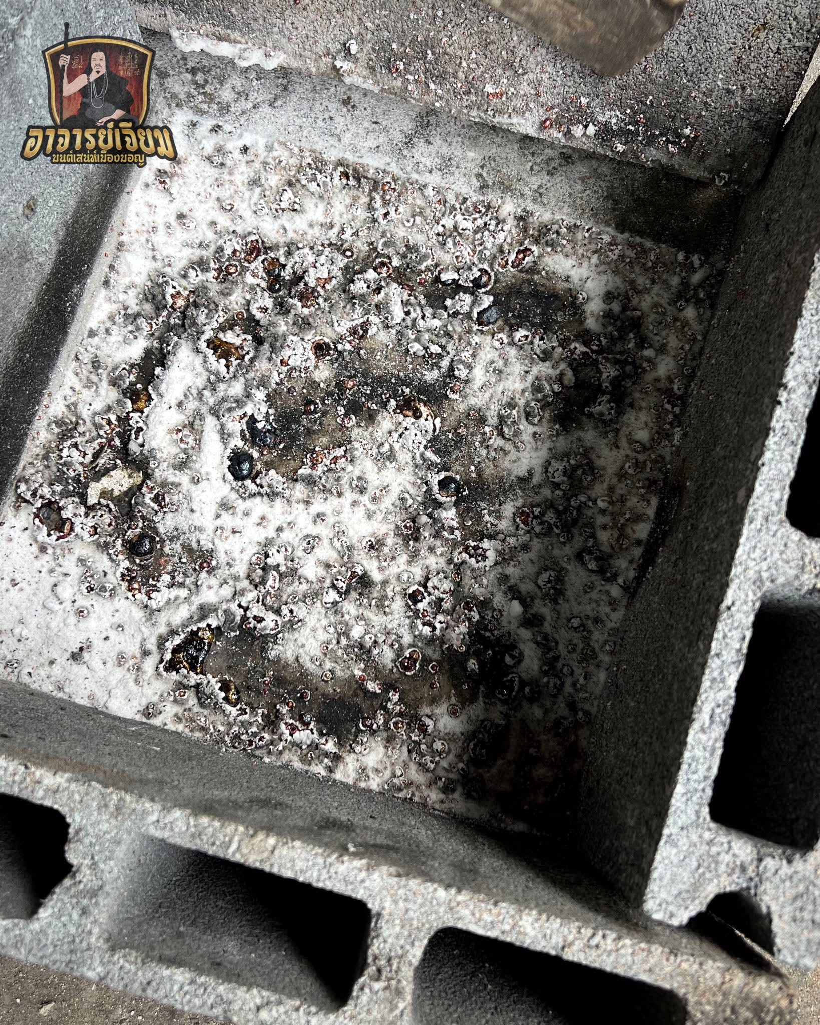 After the silver was poured into the mold, it was left to cool. Arjarn Jiam then proceeded with the bronze casting. The bronze alloy used in this process followed the foundry’s traditional formula. It included: Phra Kring remnants (copper mixed with tin) Antimony ore, Azurite ore, Ancient bronze, Sacred material remnants from Arjarn Jiam’s previous creations, Melted medallions of revered monks, Pure silver was also added to the mix. This was done to ensure the composition closely matched that of the original prototype Ngang, which, upon analysis, was found to contain silver as part of its alloy.