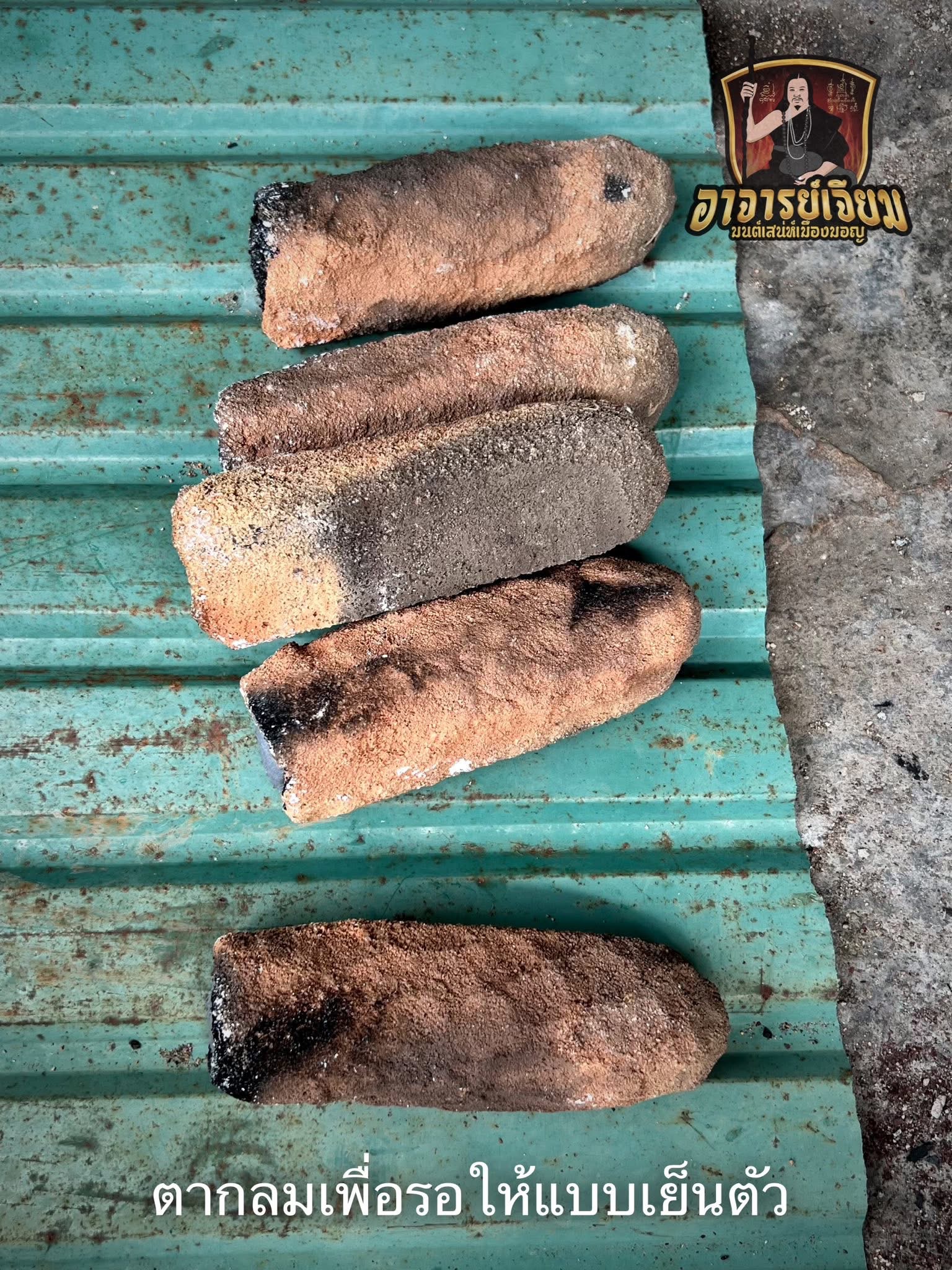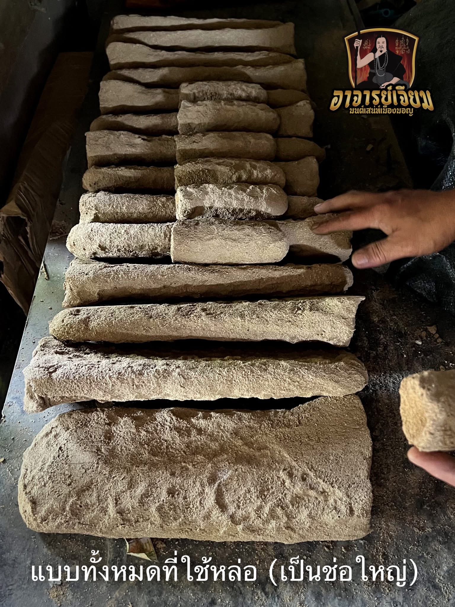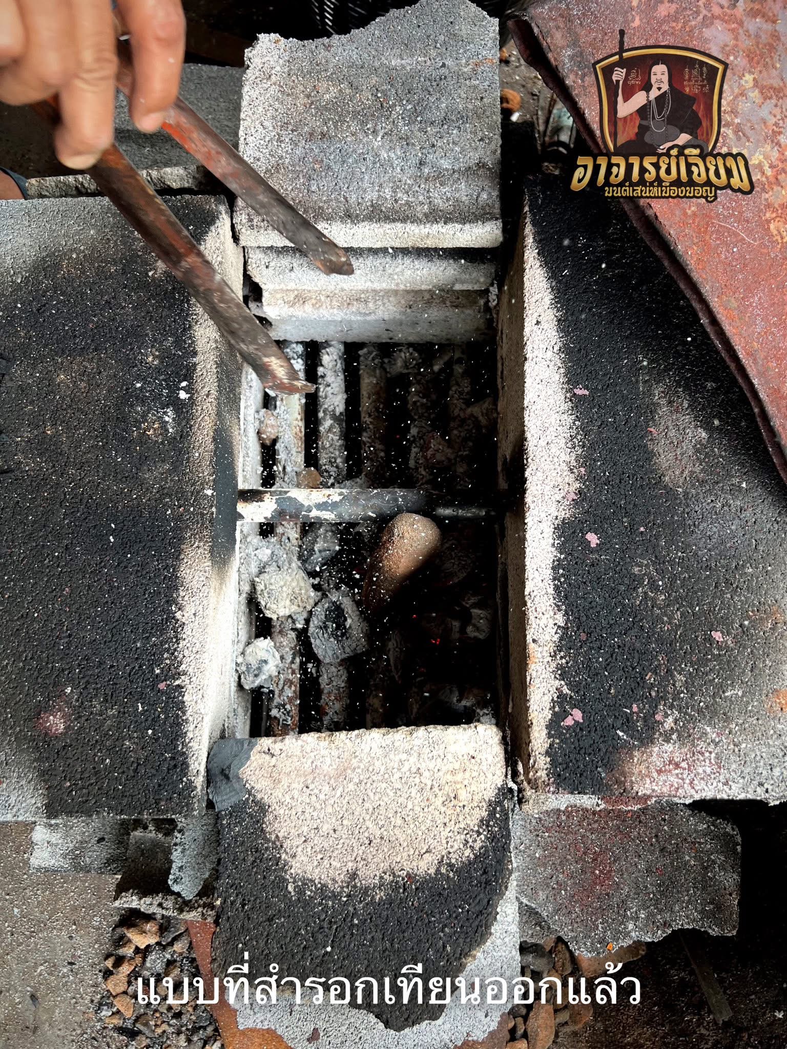 On Sunday, May 25, 2025, Arjarn Jiam traveled to the foundry to cast the special edition of Crescent Moon Emperor Ngang, using the traditional Thai earthen mold casting method (The Din Thai method). The auspicious first pieces were cast in silver and bronze. The chief artisan of the foundry had prepared the kiln for preheating the molds since the morning. The kiln was constructed in the traditional way by stacking concrete bricks and firing with charcoal. This stage involves heating the molds to melt and expel the wax (known as “samrok thian” or wax burnout). The temperature, heat levels, and duration of the preheating process directly affect both the success of the casting and the color of the clay used in the molds.