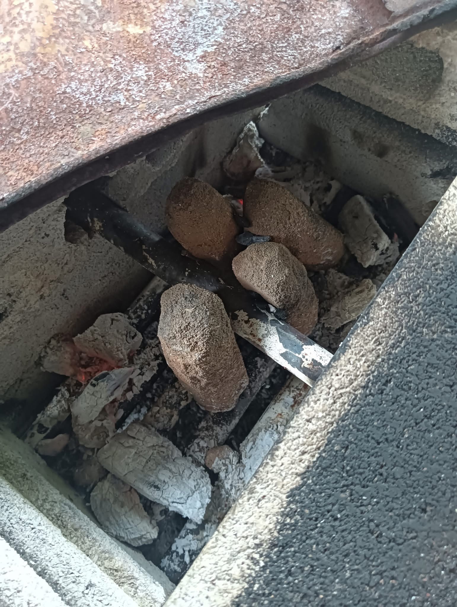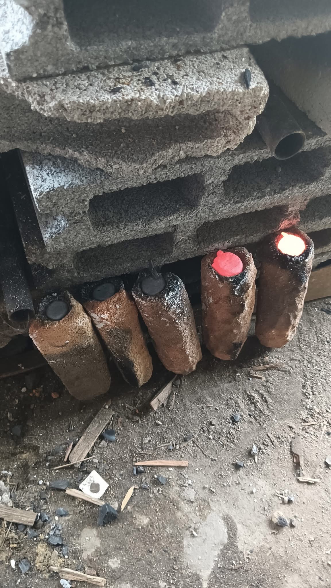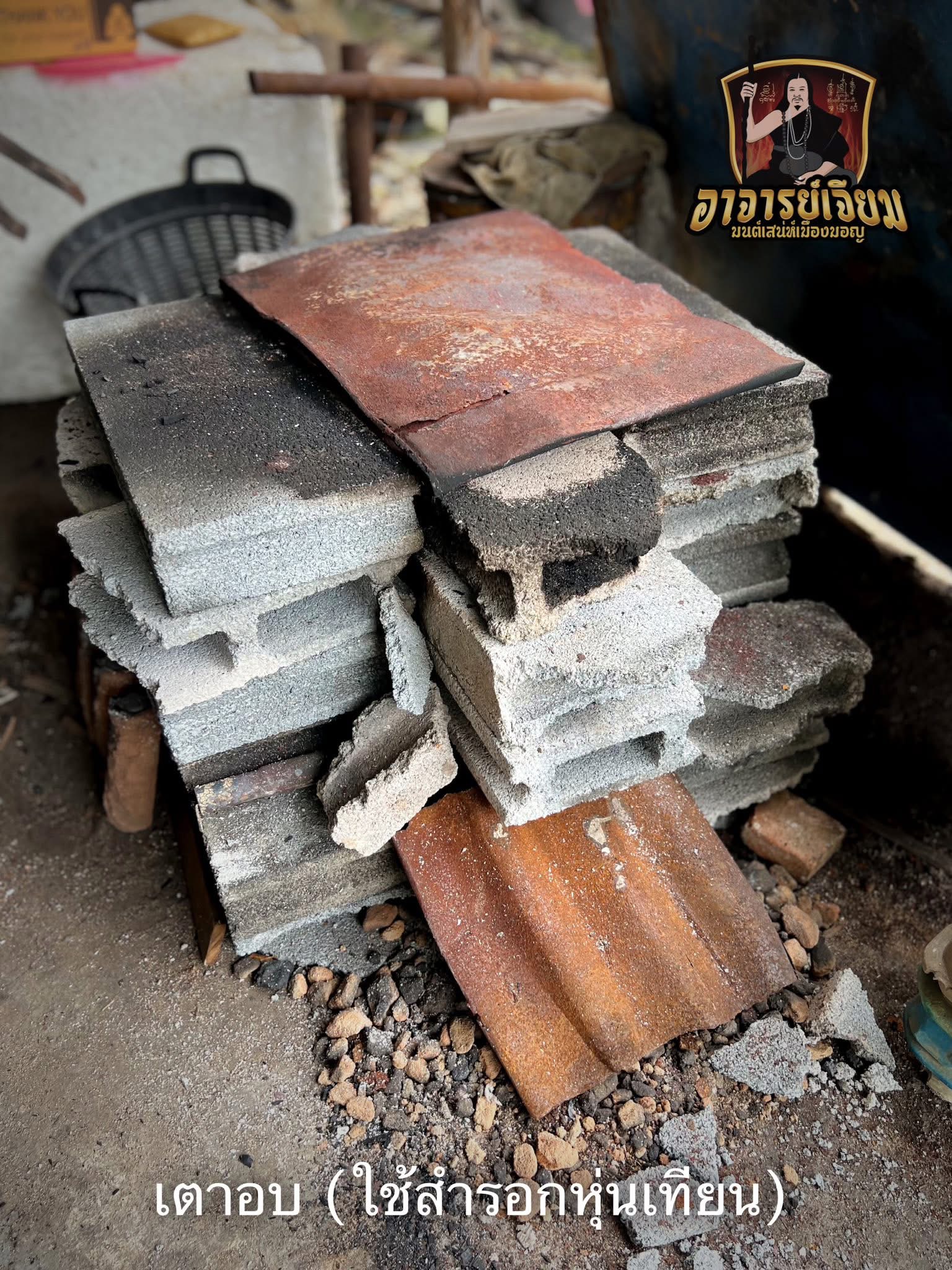 On Sunday, May 25, 2025, Arjarn Jiam traveled to the foundry to cast the special edition of Crescent Moon Emperor Ngang, using the traditional Thai earthen mold casting method (The Din Thai method). The auspicious first pieces were cast in silver and bronze. The chief artisan of the foundry had prepared the kiln for preheating the molds since the morning. The kiln was constructed in the traditional way by stacking concrete bricks and firing with charcoal. This stage involves heating the molds to melt and expel the wax (known as “samrok thian” or wax burnout). The temperature, heat levels, and duration of the preheating process directly affect both the success of the casting and the color of the clay used in the molds.