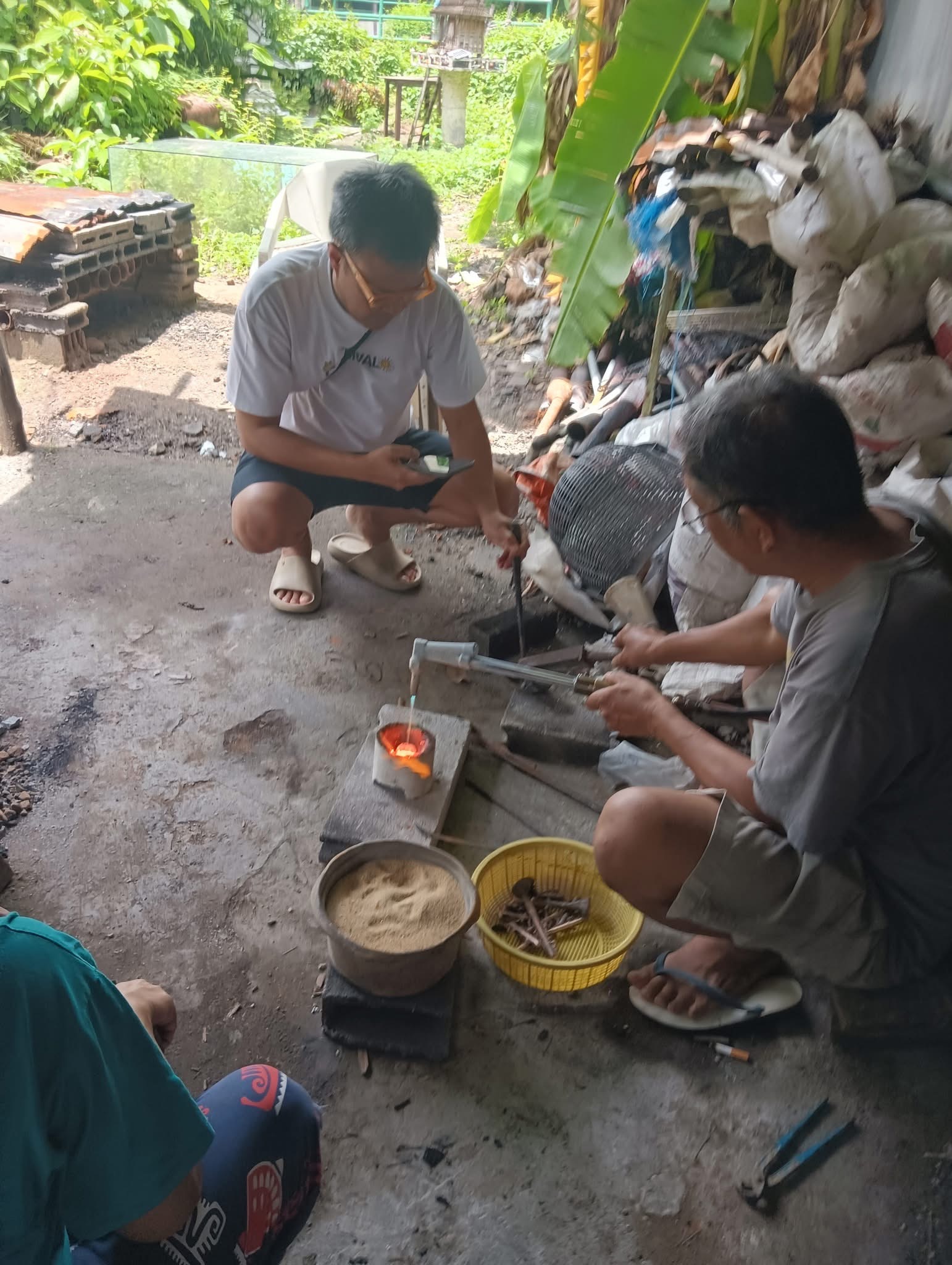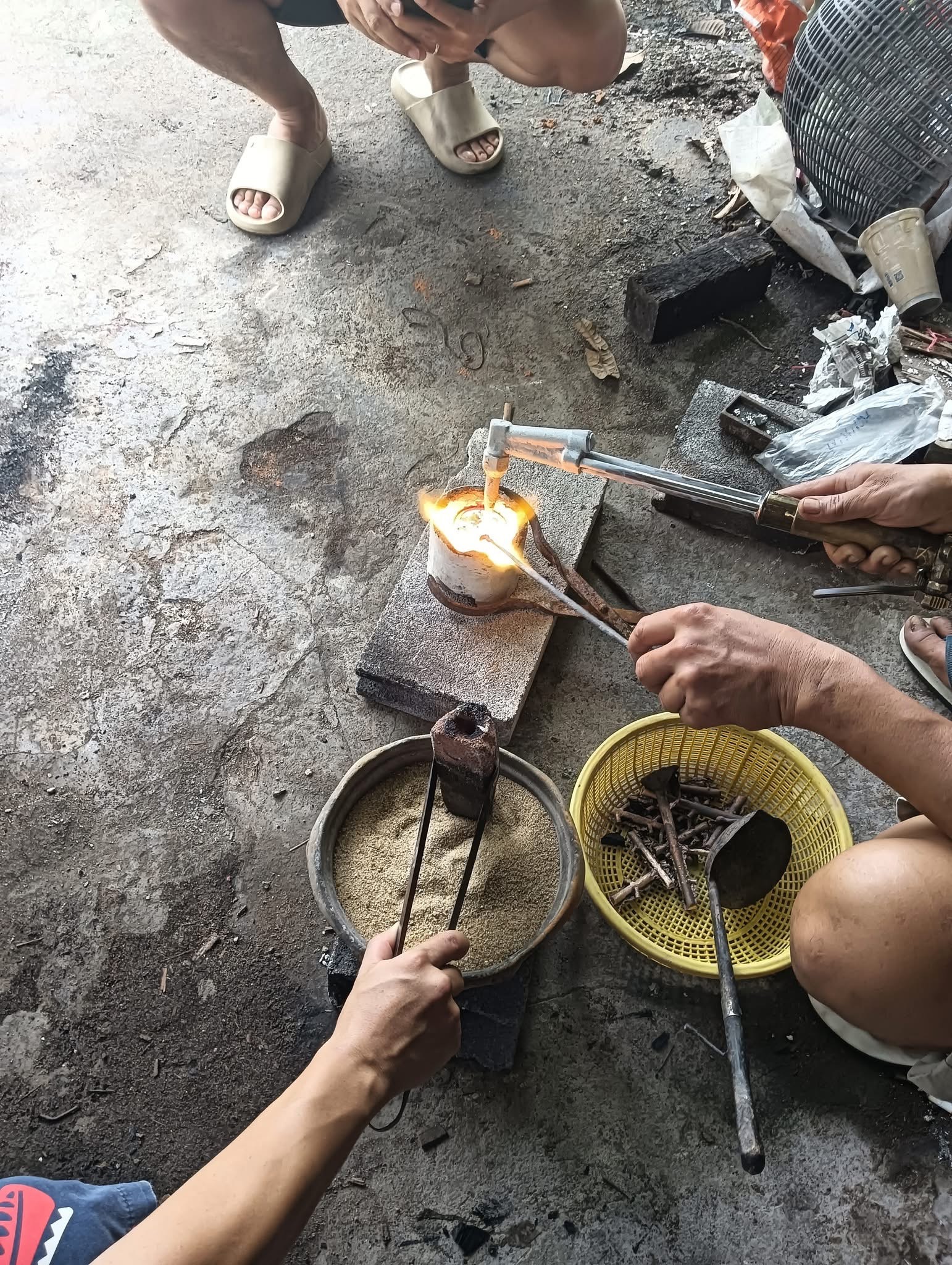 อาจารย์เจียมเตรียมโลหะและชนวนมวลสารให้สะอาดก่อนนำไปหลอมเข้าเบ้า