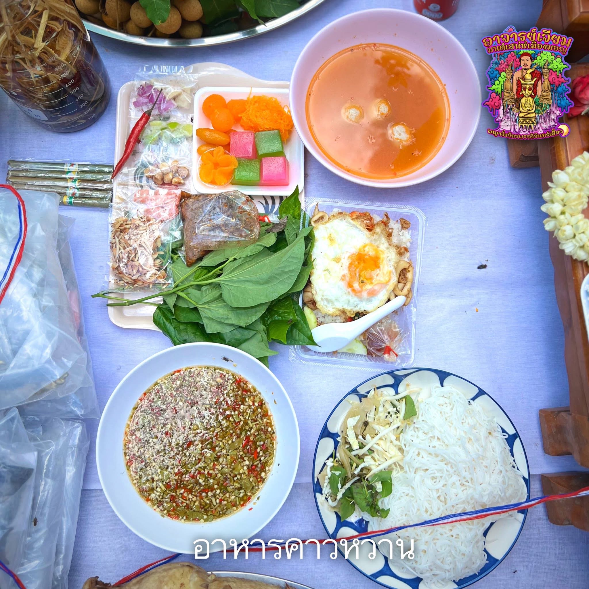 ถวายอาหารคาว ขนมหวาน ผลไม้ เครื่องดื่ม เหมือนที่เรารับประทาน (ตามสะดวก)
