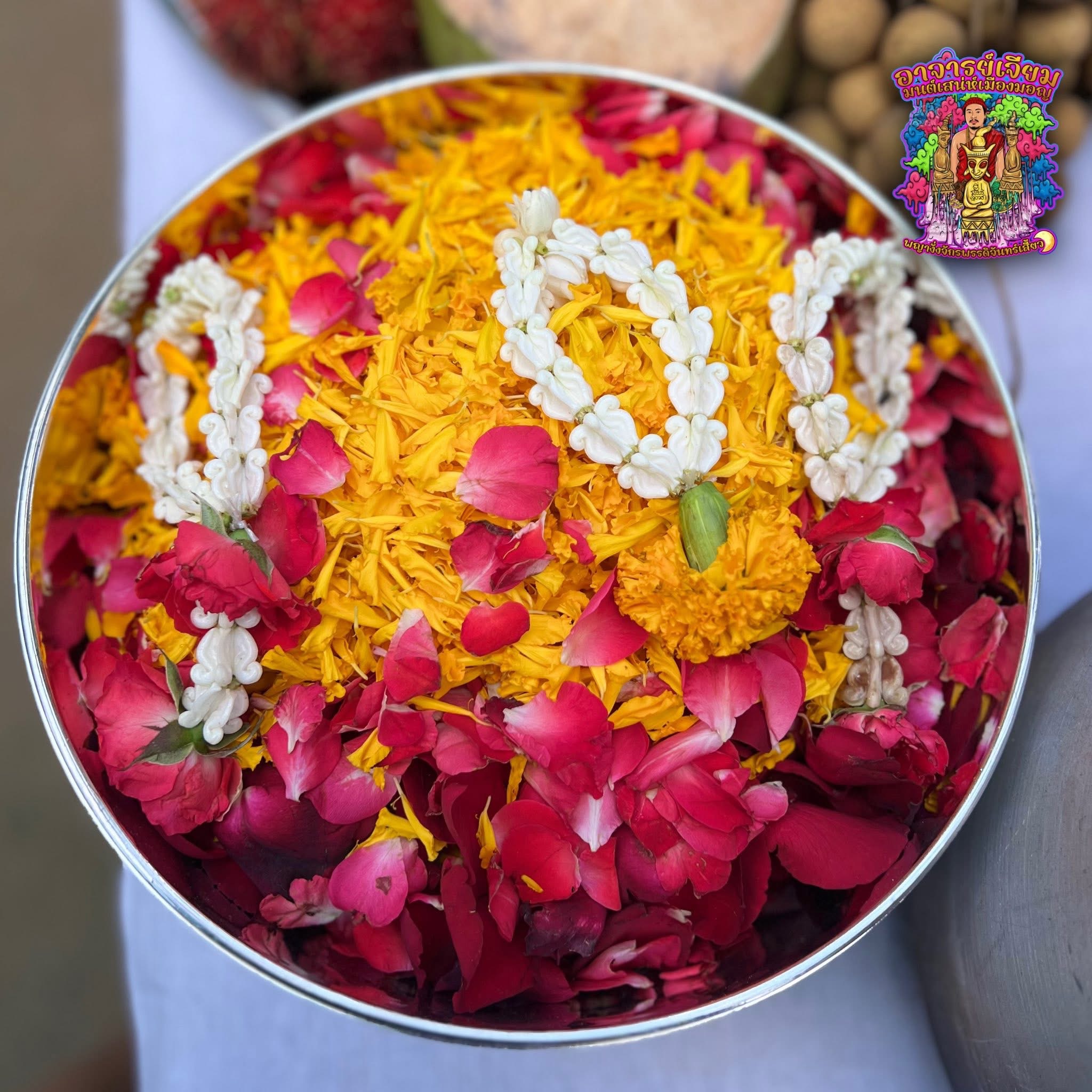 ถวายน้ำผึ้ง พวงมาลัย ดอกกุหลาบ ดอกมะลิ ดอกจําป ดอกจําปา ดอกกระดังงา (ตามสะดวก)