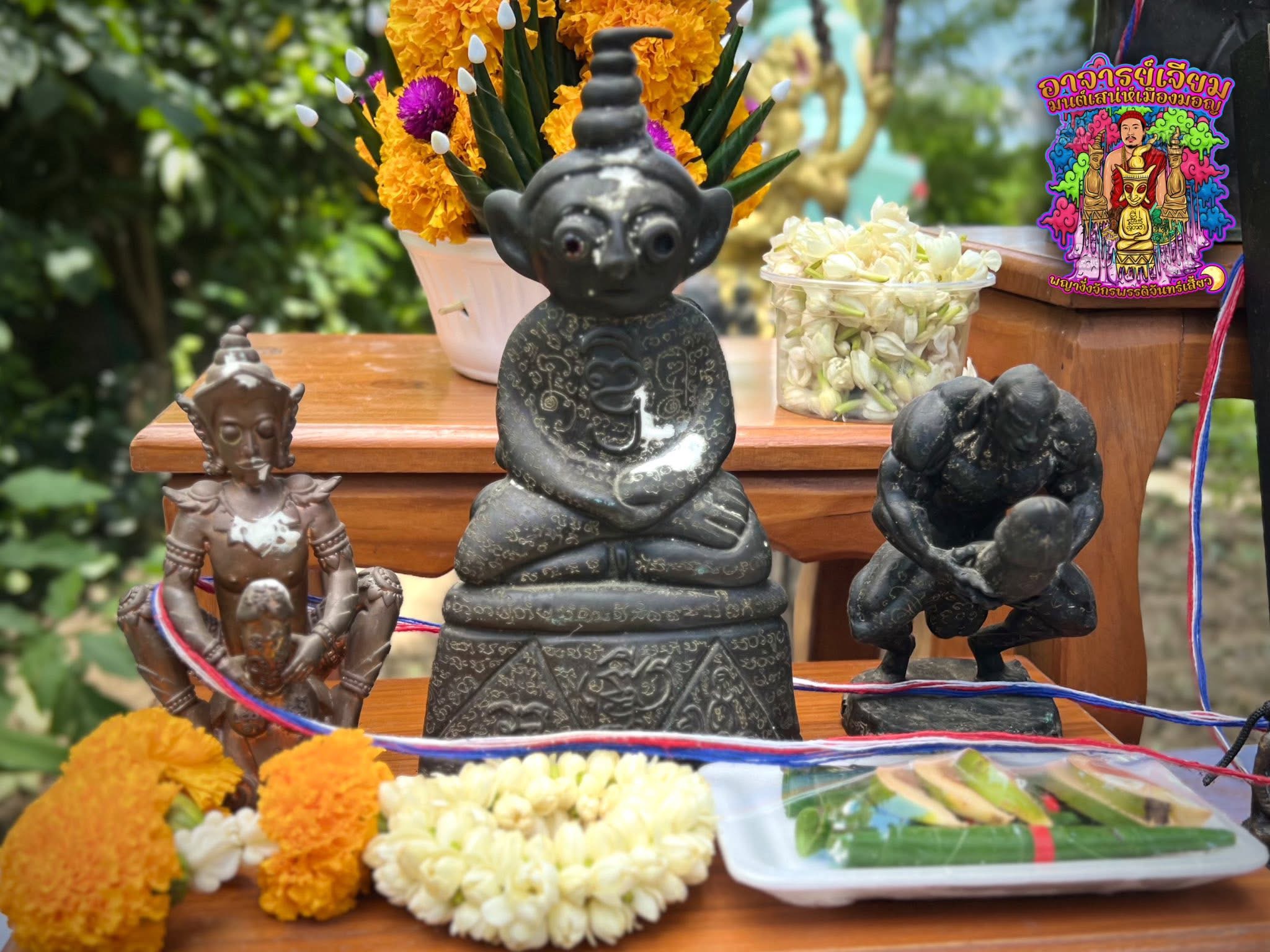 The 6-inch worship statue was created by Ajarn Jiam as a commemorative piece for the sanctuary and is not available for sale.