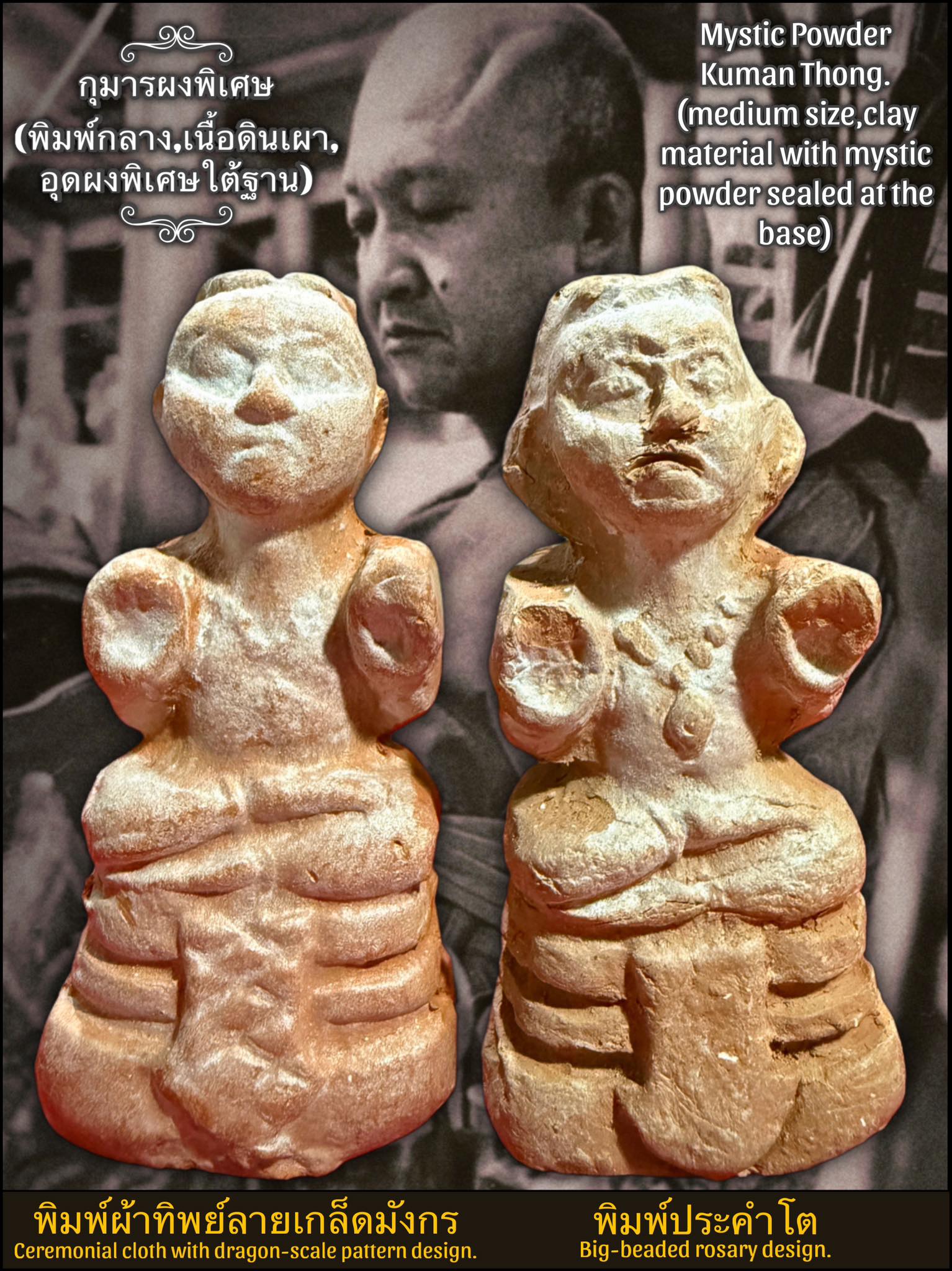 Thus, the mystic powder personally crafted by Luang Por Chamnan for the creation of this Kuman Thong edition is ofthe highest sanctity, infused with purity, spiritual power, supernatural force, and divine energy beyond comparison.The owner of this sacred amulet can wear it with complete confidence, knowing that supernatural being, mighty deities, venerable masters, and sacred energies rooted in the highest magical traditions have all been ritually invoked and fully embedded into this Kuman Thong. It was consecrated in the precise and authentic way passed down by the great masters of ancient times.