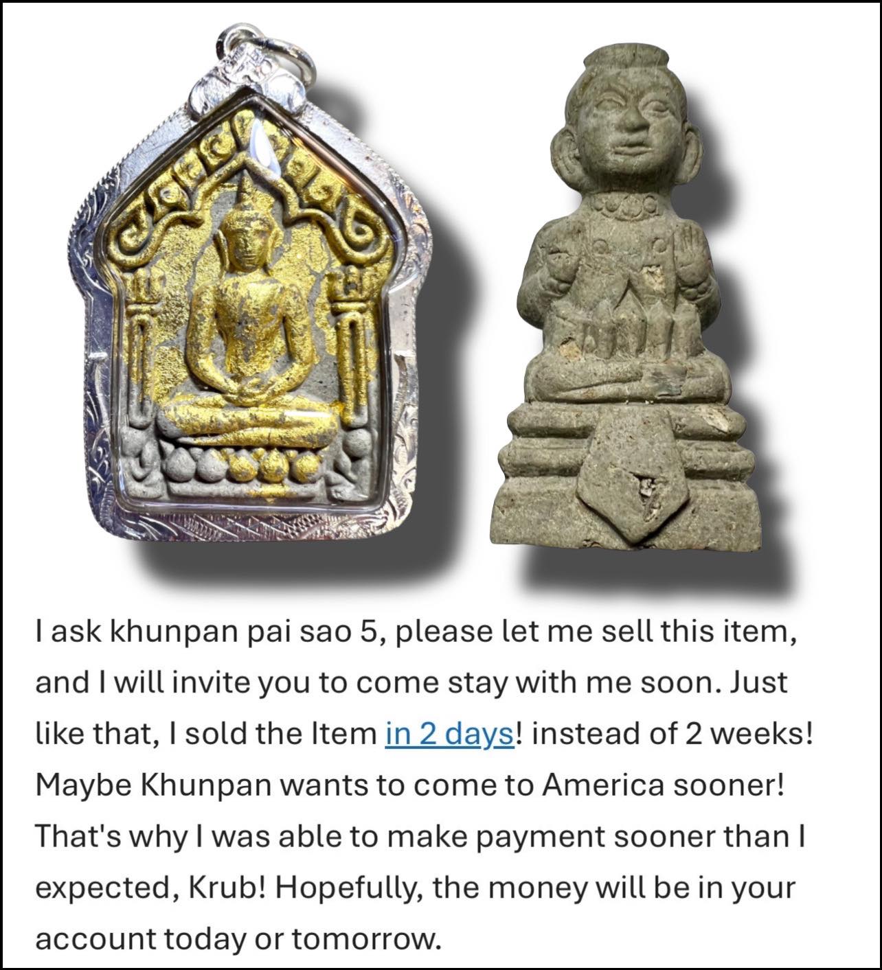 ผู้ศรัทธาท่านนี้ตั้งใจว่าสักวันหนึ่ง จะต้องบูชาพระขุนแผนผงพิเศษ (ขุนแผนเสาร์๕) ของหลวงพ่อชำนาญให้ได้ จึงตั้งจิตอธิษฐานกับรูปว่าขอให้ขายของได้ไวที่สุด ปรากฏว่าแค่เพียง 2 วัน คำอธิษฐานเขาก็เป็นจริง จึงรับกุมารผงพิเศษไปบูชาด้วยพร้อมกันเลย The word "Someday" means something different to everyone. Some wait for months, others for years, and there are those who wait a lifetime yet never get the chance to see that day. This devotee had long intended that someday, he would worship the Mystic Powder Khun Phaen (Khun Phaen Sao Ha) by Luang Por Chamnan. So he made a heartfelt prayer in front of the image on our website, asking to sell his goods quickly. Amazingly, within just two days, his wish came true. As a result, he also brought home the Mystic Powder Kuman Thong for worship at the same time. ![]() ตำนานเด็กเทพวัดชินมีอยู่จริง