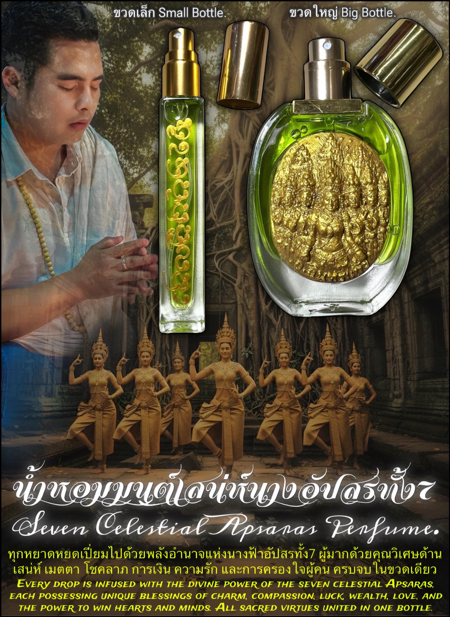 Each of the seven Apsaras possesses a distinct and exceptional power, and when all seven are brought together, their combined blessings encompass the full essence of the sacred art. This perfume requires no chanting or ritual invocation by the user, Arjarn Inkaew has already fully empowered it through intensive incantations. With absolute confidence in its potency, one simply needs to set their intention and spray, no doubts needed.
