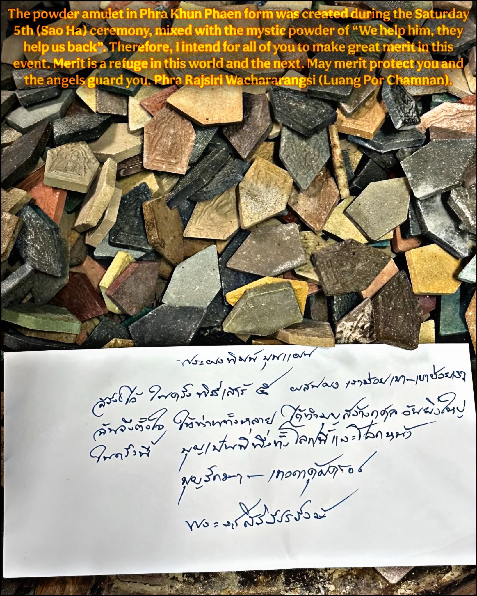 This edition of the Phra Khun Phaen amulet was immersed in holy water and continuously consecrated by Luang Por Chamnan for a full yearbefore being released to devotees for merit-making on September 14, 2025. As a result, every Angel Arms Khun Phaen carries dried residue of the holy water on its surface, which is a distinctive feature of this edition, making each piece unique and one of a kind. Luang Por Chamnan created the Angel Arms Khun Phaen, modeled after the pentagon-shaped Angel Arms Khun Phaen discovered in the Ban Krang Temple treasure in Suphanburi province. It is considered one of the ancient Khun Phaen amulets, with legends recounting its miraculous powers and sacred potency from the past to the present. This amulet is called “Angel Arms Khun Phaen” because of the slender and elongated arms of the Buddha figure like the arms of a celestial angel, both arms gently resting against the body in a graceful and elegant manner. It is well known among Luang Por Chamnan’s disciples that his Phra Khun Phaen amulets are among the most powerful sacred objects, crafted using the highly potent Mon Raman charming traditions.Those who have had the opportunity to possess or experience the effects of his amulets, especially the early editions released at Wat Bang Kudi Thong know well that Luang Por Chamnan’s Phra Khun Phaen is unmatched in the realms of loving-kindness and popularity (Metta Mahaniyom) and great charm and attraction (Mahasaneh). Some may have even heard stories of certain editions of Phra Khun Phaen that Luang Por decided to enshrine in a hidden chamber shortly after they were released. This was because some individuals misused the amulet’s charm-inducing powers, causing unnecessary trouble. Such incidents occurred often enough that Luang Por Chamnan had to give a firm reminder to his followers, saying: “My Phra Khun Phaen Is Not To Be Used For Immoral Purposes, Don’t Even Think Of Going After Someone’s Child Or Spouse”. Phra Khun Phaen is thus one of the sacred amulets that Luang Por Chamnan creates only on rare occasions. Each edition is crafted with a specific purpose and features its own unique spiritual identity. Luang Por Chamnan follows the ancient Phra Khun Phaen traditions in his creation, meticulously empowering each piece with sacred incantations to instill exceptional loving-kindness and popularity (Metta Mahaniyom). Phra Khun Phaen of Luang Por Chamnan is known for their powerful charm, bringing great attractiveness, drawing good fortune, and ensuring profitable ventures in business and trade. It is believed to attract wealth, opportunities, and the goodwill of people from near and far, in accordance with the wishes of the wearer. It is said that celestial beings watch over and protect those who possess Phra Khun Phaen, shielding them from hardship and guiding them toward a life of abundance and support.