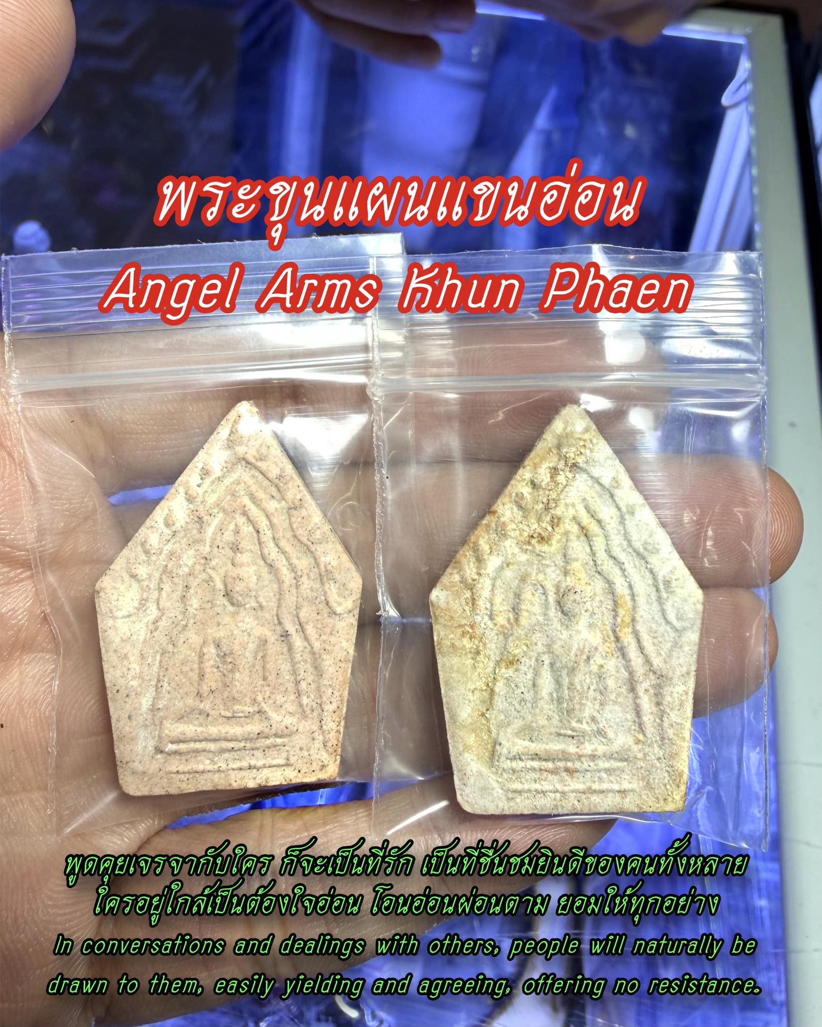 It is believed that the spiritual benefits of the Angel Arms Khun Phaen are exceptional in the realm of charm and popularity. Those who carry or worship it are said to be loved and admired wherever they go. In conversations and dealings with others, people will naturally be drawn to them, easily yielding and agreeing, offering no resistance.