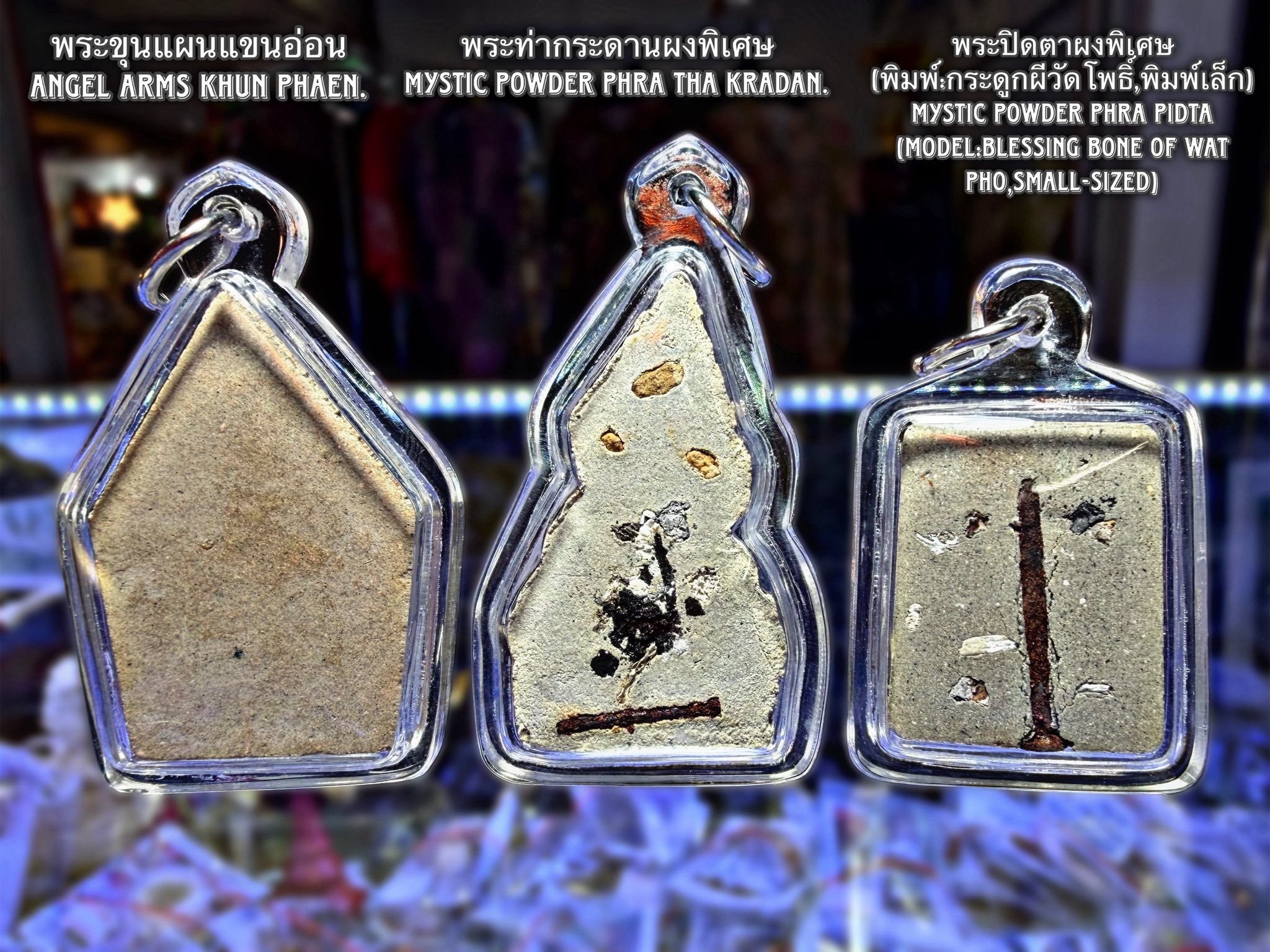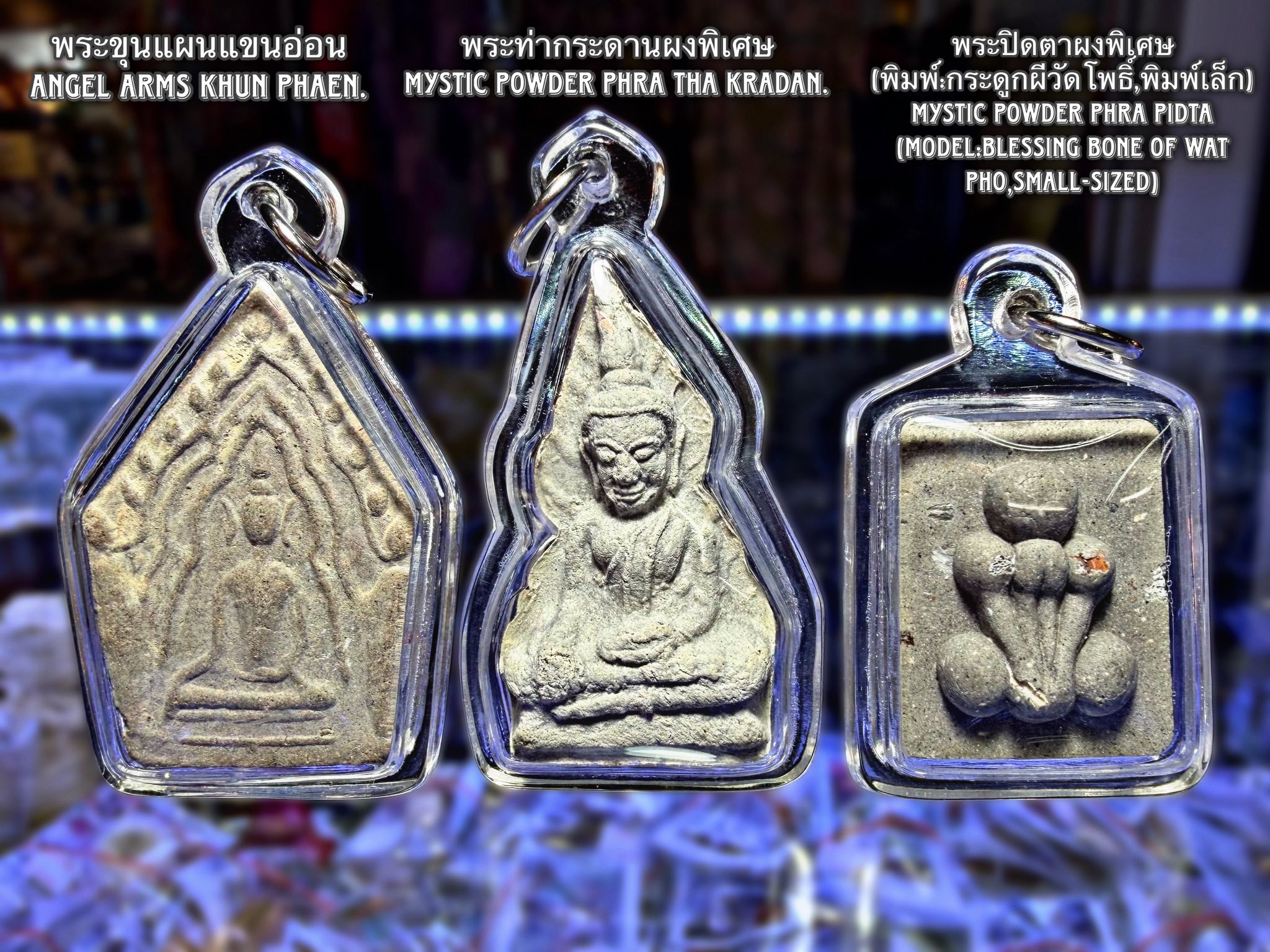 The three mystical amulets of Wat Chinwararamfrom the most renowned mystic powder. This devotee intends to complete the full collection of mystic powder amulets of Luang Por Chamnan, and we are ready to grant his wish. To the naked eye, one sees only three amulets, but to the inner eye, the sight is no different from an army of celestial beings.